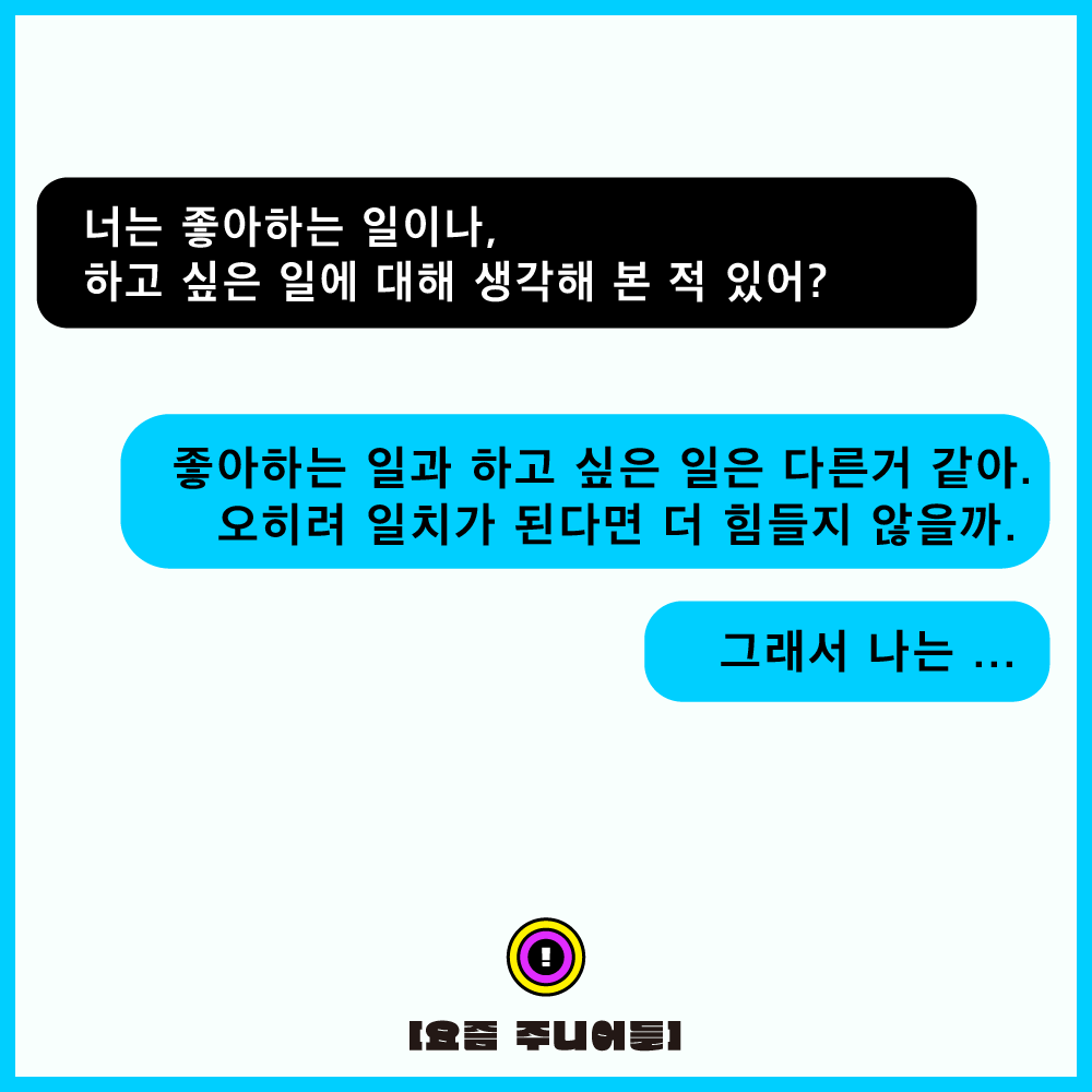 좋아하는 일과 하고 싶은 일은 다르다고 생각해. 적어도 일에 있어서 좋아하는 일을 하지 않아도 된다고 생각해. 오히려 일치가 된다면 더 힘들지 않을까.