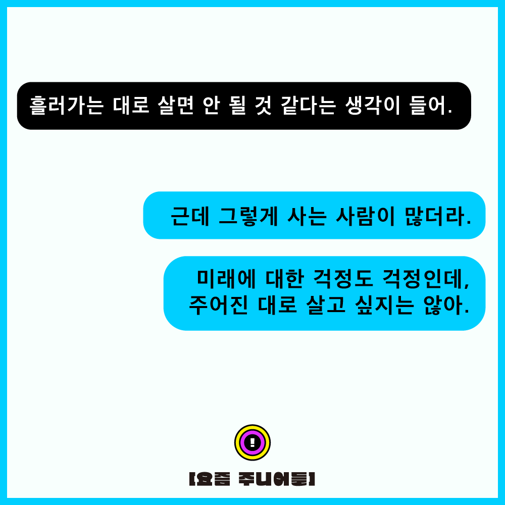 근데 그렇게 사는 사람이 많아. 미래에 대한 걱정도 걱정인데, 그저 주어진 대로 살고 싶지는 않아.