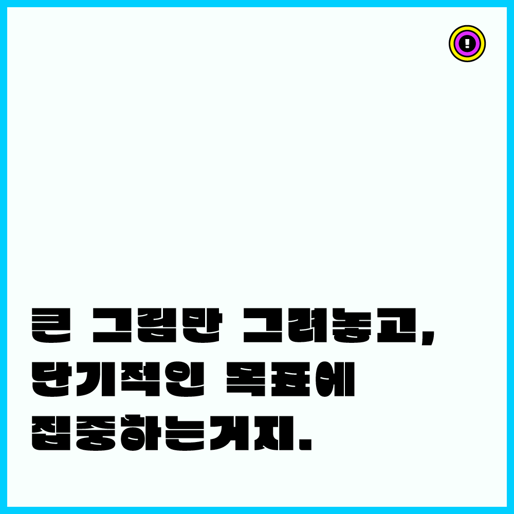 단기적인 것에 집중하는 게 중요한 거 같아. 큰 그림을 놓치지는 말고. 나는 큰 그림이 있긴 한데, 일부러 디테일하게 그리지 않아. 스트레스받지 않기 위해서 대략적인 방향만 생각하고, 뭘 하고 싶은지만 만들었지. 그 외에는 하루하루 열심히 하는 거. 그게 다야.