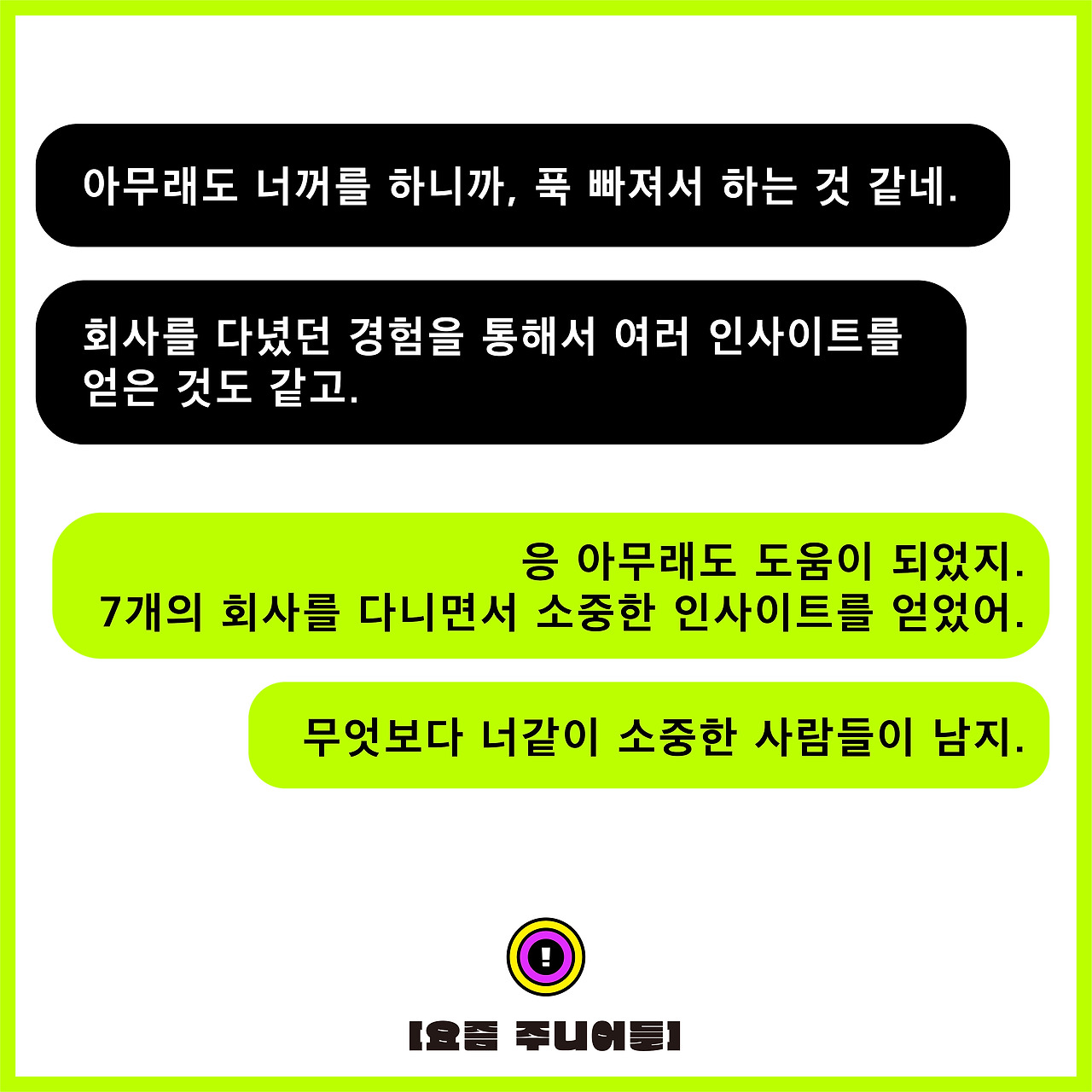 응 아무래도 도움이 되었지. 7개의 회사를 다니면서 소중한 인사이트들이 생겼지. 무엇보다 너같이 소중한 사람들이 남지. 사람이 남아.