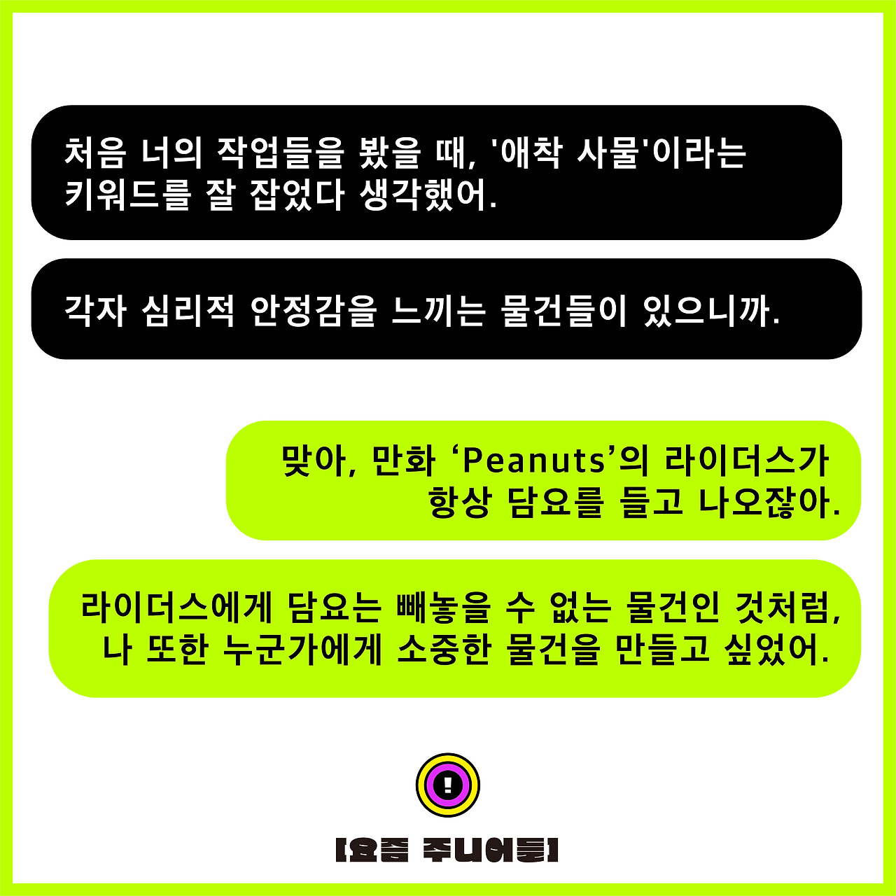 맞아. 만화 ‘Peanuts’의 라이더스가 항상 담요를 들고 나오잖아. 그게 상징성이 있더라고. 라이더스에게 담요가 빼놓을 수 없는 물건인 것처럼, 나 또한 누군가에게 그 정도로 소중한 물건을 만들고 싶었어.