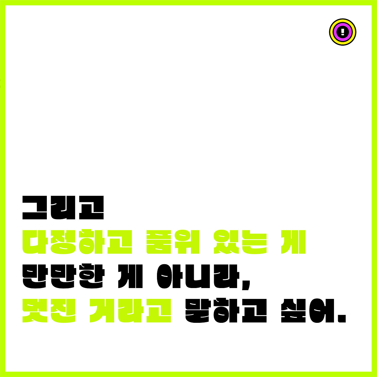 반면에 내가 하고 싶은 건 사람들을 위로하는 거야. 다정하고 품위 있는 사람들이 많아졌으면 좋겠어. 그 과정에 일조하고 싶고, 유대하고 싶어. 다정한 마음으로 품위까지 지키며 살면, 자칫하면 누군가는 나를 만만하게 볼 수도 있는 서늘한 세상에 살고 있는 것 같다는 생각을 종종 해. 하지만 다정하고 품위있는게 진짜 강하고 우아한거라고 이야기하고 싶어.