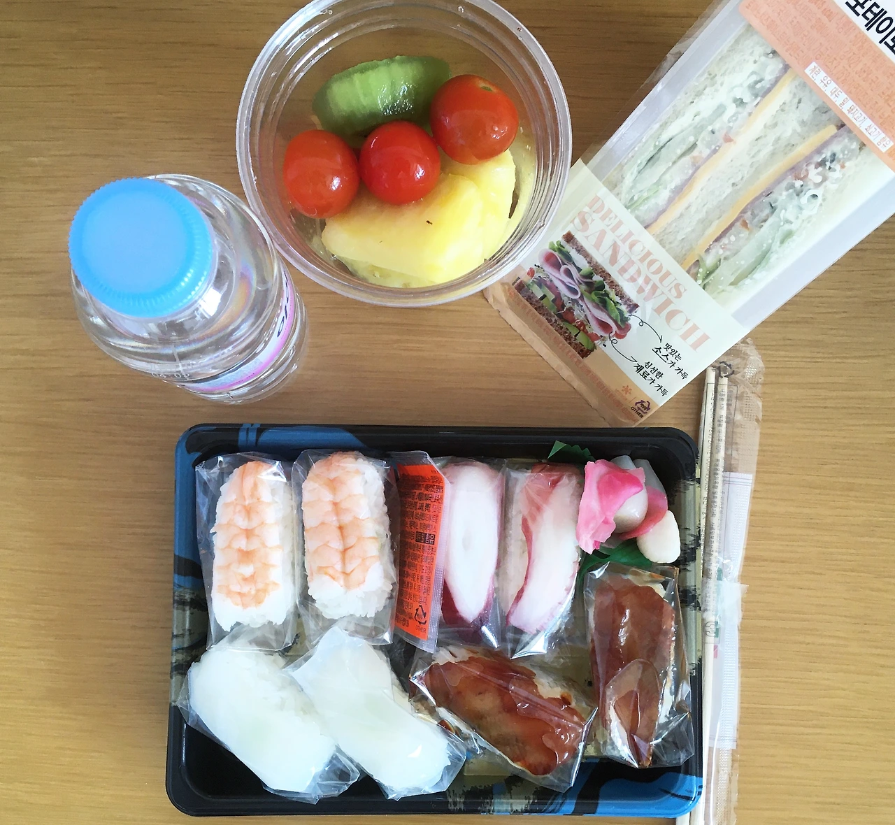 점심 메뉴는 초밥이 8조각 들어있는 도시락과 과일, 샌드위치, 생수 한 병이다.