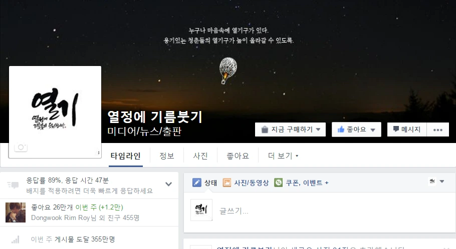 물론, 페이스북 페이지 26만이 특별하게 대단하거나 큰 숫자는 아니다. 당장 타임라인만 내려봐도 100만, 200만짜리 페이지들이 많다. 하지만 우리는 두 가지 측면에서 '열정에 기름붓기의 26만'은 조금 특별하다고 생각한다.