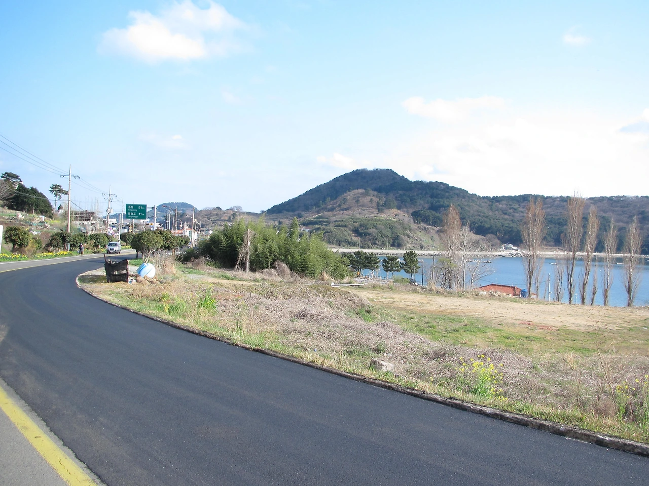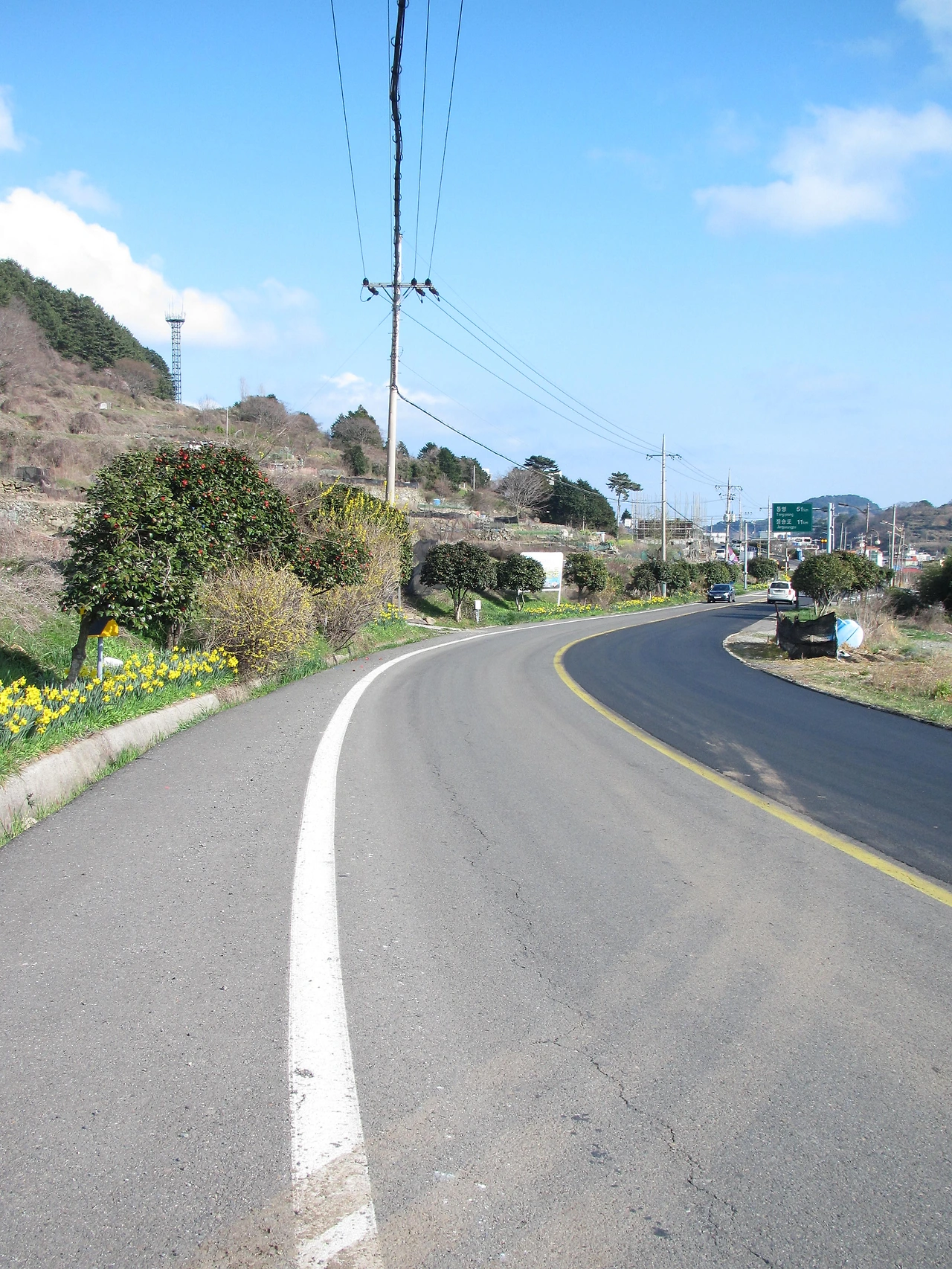 ‘한국의 아름다운 길’이라는 표지판이 눈에 들어왔다. 오전에 비가 온 뒤라 그런지 더 맑아진 새파란 하늘과 끝없이 달려도 쫒아오는 바다 그리고 수선화와 동백, 벚꽃이 알록달록 예쁘게 심긴 꽃 길 까지 뭐하나 빠진 듯 없이 완벽했다.