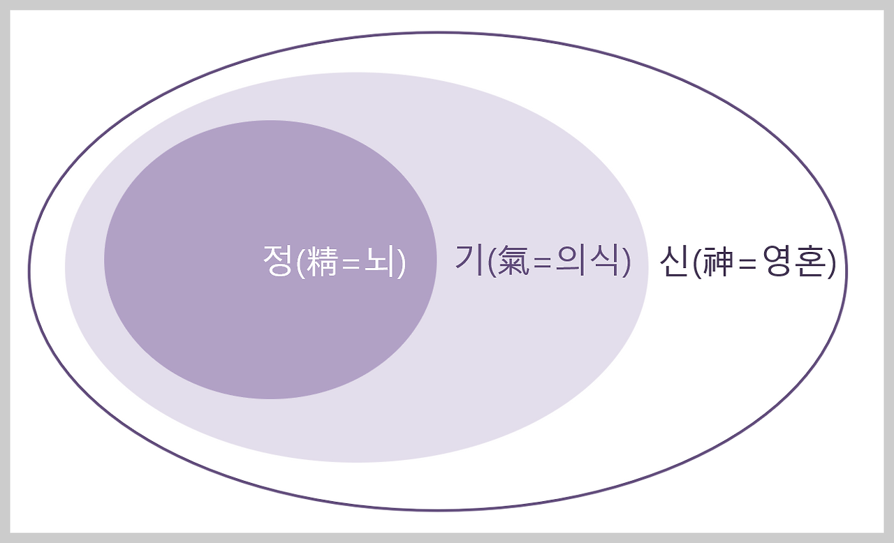 존재를 이런 식으로 규정하면 몸과 마음이 어떻게 영향을 주고받는지는 전혀 문제가 되지 않는다. 둘이 아니기 때문이다. 만약 호수에 바람이 분다면, 당연히 물도 흔들리고 공기도 흔들릴 것이다. 물의 흔들림은 정(精)에 영향을 주어 몸으로 감각될 것이고, 수증기의 흔들림은 기(氣)로 이루어진 심체를 흔들어 마음으로 감각될 것이다. 그리고 그 바탕이 되는 ‘나’, 다시 말해 정과 기가 응집되도록 했던 근원적 존재장으로서의 신(神)은 이 모든 변화를 일으키고 느끼는 주체로 그 모든 변화를 지켜보게 될 것이다.