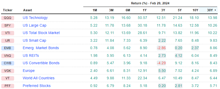아래는 최근 30년 동안의 자산군별 수익률을 연평균으로 표현한 표이다. 수익률 상위 10개의 자산 중에서 8개는 주식형 ETF이며, 2개만이 채권형 ETF이다. 이외에 금(GLD)은 5.46%, 원자재(DBC)는 4.00%이다. VNQ는 미국 상업용 부동산이기 때문에 부동산의 가치와 정확하게 일치하지 않지만, 그 흐름은 유사하기 때문에 부동산의 수률(8.86%)으로 보아도 무방할 것이다. 주식이 가장 수익률이 높은 자산군이다.