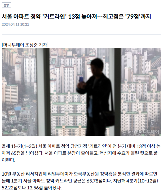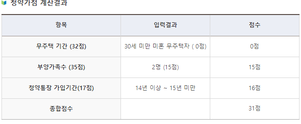 무주택기간, 부양가족수, 가입기간을 고려한 나의 청약가점은 31점으로 계산된다. 반면, 서울 아파트 청약 평균점수는 약 65점으로 나의 점수와는 상당한 괴리가 있다.