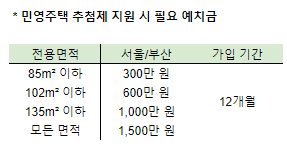 가입 후 12개월이 지나면 1순위 자격을 부여함으로 추첨제에 지원할 수 있다. 예치금 역시 청약 전 일시납해도 인정이 되기 때문에 필요한 때까지 다른 곳에 활용이 가능하여 합리적이다.