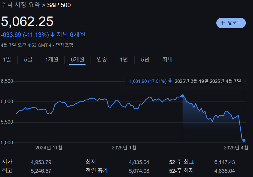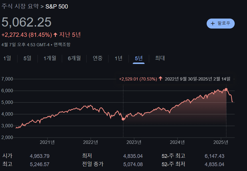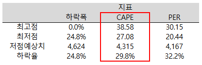 지난번 하락장은 금리가 모든 것을 결정했다고 볼 수 있다. 즉, 금리만 보면 주가의 향방이 어느 정도 예상할 수 있었다. 하지만 이번 조정장은 한 달 사이에 급락했다는 점, 미국 정부의 관세정책에 따라 조변석개할 수 있다는 점에서 한 가지 변수로 설명하기 어렵다고 생각했다. 그래서 3가지 지표를 가지고 어디까지 내려갈 수 있을지 계산해 보았다.
