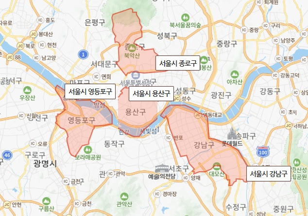 이제 어디에 집을 살지 찾아보자. 네이버 지도를 펴서 서울 3대 업무지구와 용산구를 그려보니 생각보다 답이 쉽게 나왔다. 회사와 인접한 구는 마포구와 동작구뿐이다. 성동구는 용산구와는 인접해 있으나, 회사와는 꽤 거리가 있다. 회사랑 가까운 동마포에서는 용산정비창이 가로막고 있어서 마을버스 외에는 회사를 가기는 교통편이 열악하다. 동작구만 남았다.