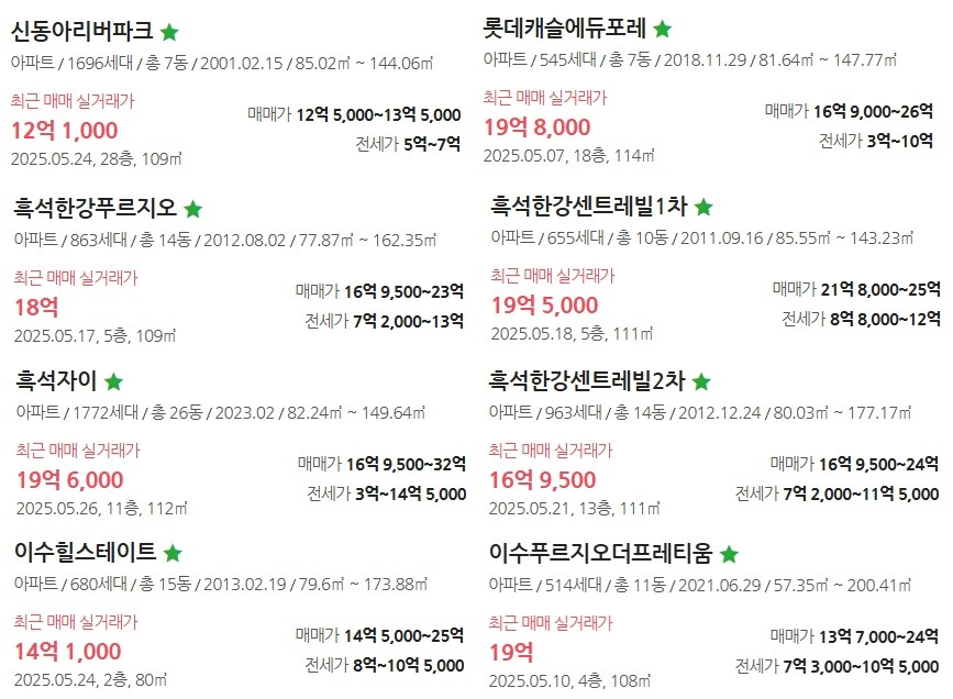 신동아리버파크와 이수힐스테이트를 제외하면 예산 내에서는 20평 대만 가능하다. 게다가 대부분 단지에서 최근에 일어난 실거래가를 기준으로도 예산은 이미 초과한다. 다만 리스트에 둔 이유는 당장 지금 집을 구매할 계획은 아니기 때문에 시장 상황에 따라 구매가 가능하다고 보았기 때문이다.