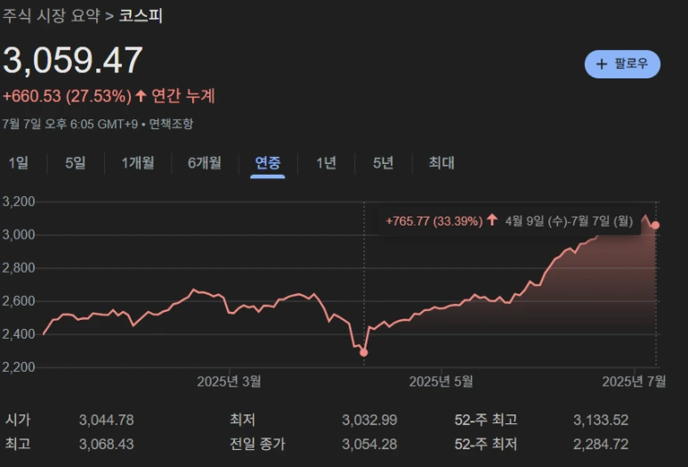 코스피 지수가 연일 주가를 갱신 중이다. 비상계엄사태가 촉발된 정치적 불안이 대통령 당선으로 끝나면서 해소가 되었다. 이 같은 불안감이 해소되면서 외국인 순매수가 지난 달만 약 1조 1400억 원에 달했다. 이어 6월도 기관과 외국인 중심으로 대형주 순매수가 늘어나고 있다고 한다. 근래 '국장 탈출은 지능순'이라는 말이 무색하게 올해 저점에서 불꽃같이 들어 올리며, 33% 상승하며 전세게 증시 상승률 1등에 등극했다.