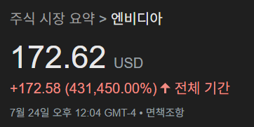 엔비디아는 24년 6월에 1주를 10주로 쪼개면서 분할 직전 1,200달러였던 주가가 120달러로 조정됐다. 엔비디아는 분할 이후 주가가 135달러까지 오르며 시가총액 세계 1위에 올랐다. 이후 1년간 급등락을 거치고 170달러를 넘어 역사상 최초로 4조 달러를 넘기는 기록을 세웠다.