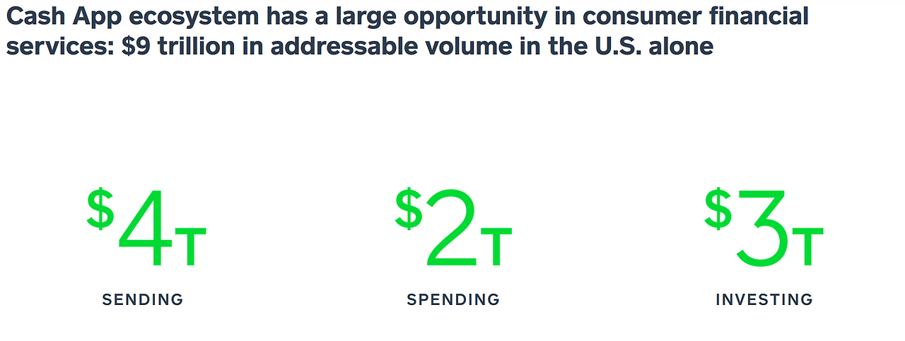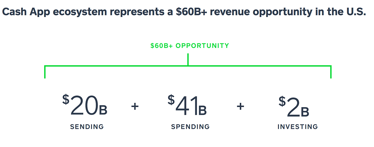 앞서 살펴본 셀러 부문만큼이나 캐시 앱 부문도 잠재적인 시장이 매우 큽니다. 스퀘어는 9조 달러(한화 9900조 원) 규모의 이체/결제/투자 관련 시장에서 600억 달러(한화 66조 원)의 수익 기회가 있다고 봅니다. 스퀘어는 이런 거대한 시장에서 겨우 2% 이하의 점유율을 가지고 있기 때문에 성장 여력이 크다고 말합니다.
