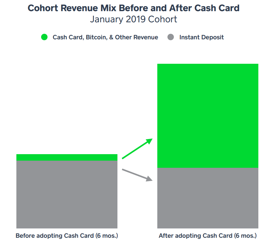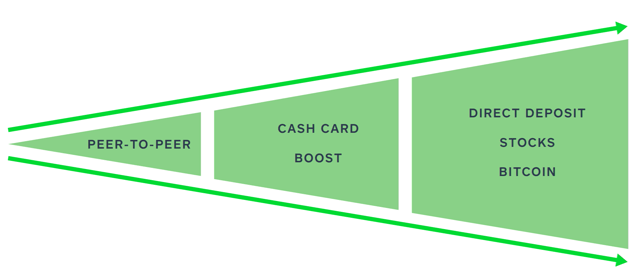 현금을 입금하고 캐시 카드를 사용한 고객의 6개월 후 캐시 앱 이용 정도입니다. 유저는 더 많은 소비를 하고, 투자 활동을 하게 됩니다. 이는 캐시 앱의 매출 성장과 직결되는 부분이라고 할 수 있습니다. 즉, 유저가 어떻게든 캐시 카드에 돈을 입금하는 것이 첫걸음입니다. 때문에 스퀘어는 캐시 카드의 결제뿐 아니라 금융 접근성(급여 수령, 세금 환급 등)을 높이며 직관성을 높이기 위해 UI 개발에도 많은 노력을 하고 있습니다. 입금 이후 돈을 활용하는 기능(① 부스트, ② 주식 투자, 비트코인 투자)을 끊임없이 추가하는 방향 또한 큰 틀에서 유저를 확보하기 위함입니다.
