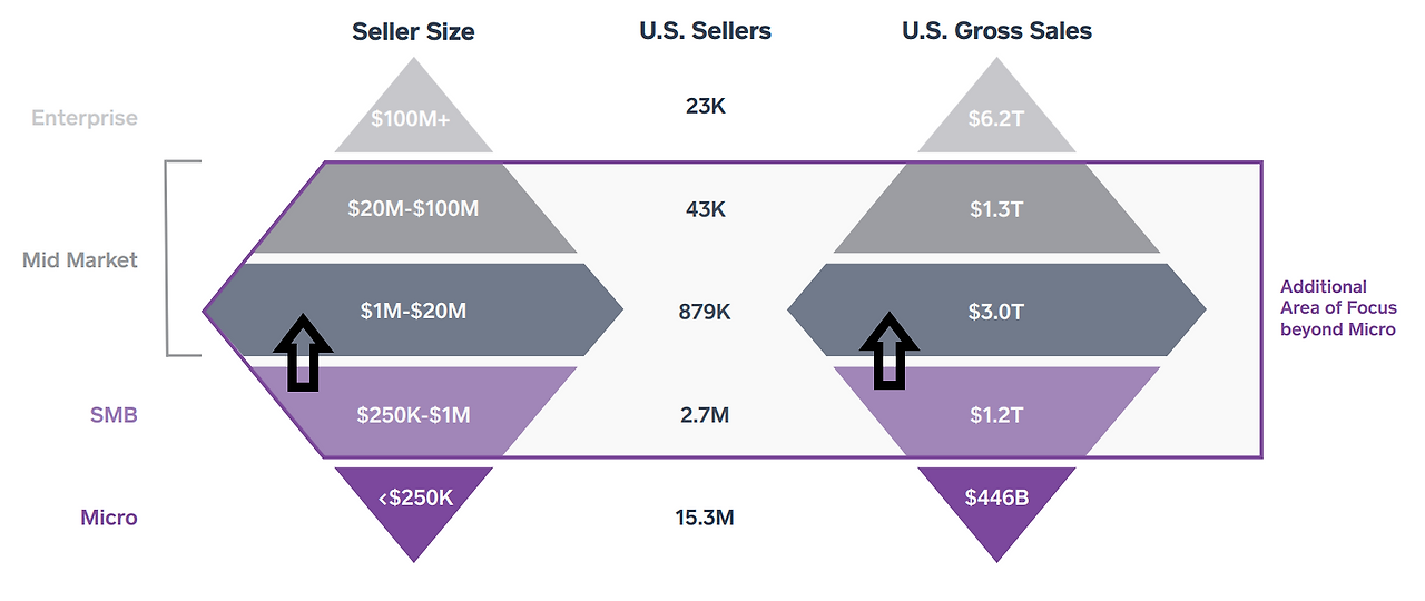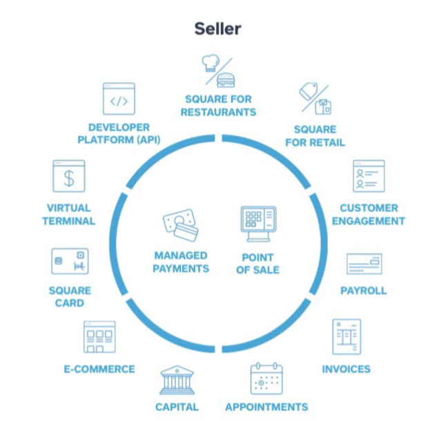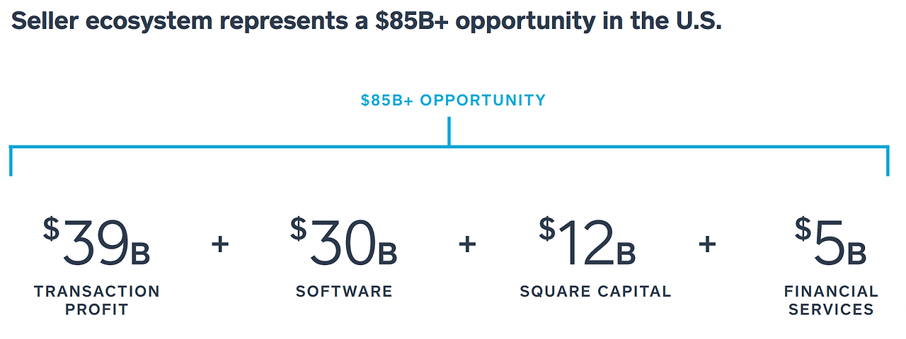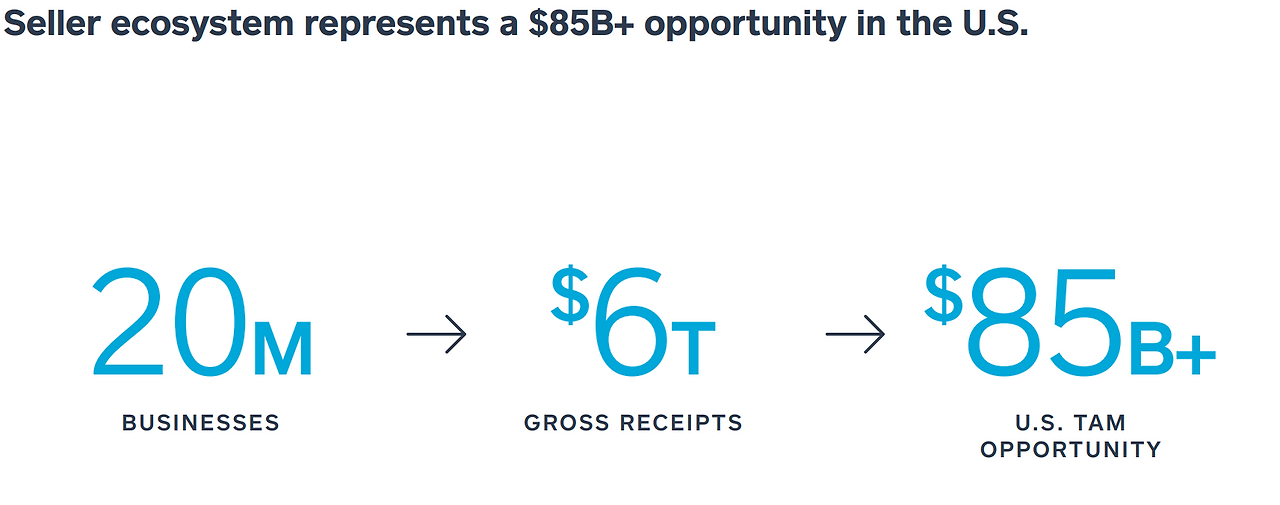 게다가 미국 셀러 비즈니스 영역은 2,000만이 넘는 사업자 활동하고 연간 약 6조 달러(한화 약 6600조 원)의 결제가 일어납니다. 2019년 스퀘어의 발표 내용에 따르면 850억 달러(한화 93조 원)의 수익 창출 기회가 있다고 합니다. 이 잠재 시장에서 각각 결제 수수료, 소프트웨어, 스퀘어 캐피탈(셀러 대출) 그리고 여러 재정 서비스 등 세부적인 시장 규모 또한 언급하고 있습니다. 셀러 부문에서 현재 스퀘어가 차지하고 있는 비중은 "3%" 보다 작다고 합니다. 그만큼 성장 가능성이 높은 부문이라고 할 수 있겠습니다.