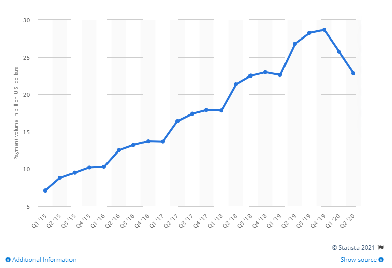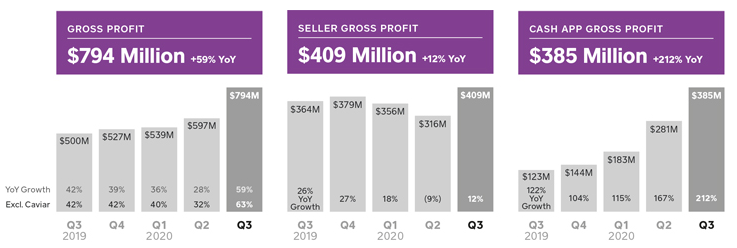 상승의 주요 원인은 COVID-19의 여파로 비대면 결제/송금이 늘어나면서 캐시 앱(Cash App)의 매출이 급성장했으며, 약달러로 인해 캐시 앱 내 비트코인 매출이 폭발적 증가했기 때문입니다. 요약하자면 캐시 앱이 '캐리'했다고 볼 수 있습니다. 인터넷을 조금만 뒤져봐도 "스퀘어가 미래의 은행을 대체할 것이다.", "스퀘어 캐시 앱의 사용자가 폭발적으로 늘어나고 있다" 등 상당히 긍정적인 내용을 찾을 수 있습니다. 마치 지금 당장 매수 버튼을 눌러야 할 것 같습니다. 하지만 '우리의 기대감이 너무 큰 것을 아닐까' 하는 생각이 들었습니다.