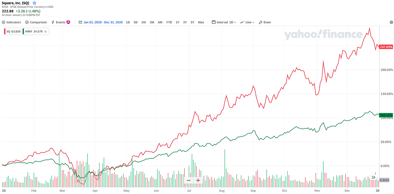 스퀘어(SQ)는 POS(Point of sales) 관련 하드웨어와 소프트웨어를 제공하는 기업입니다. 트위터의 창업자, 잭 도시가 창업했으며, ARK Investment의 핀테크 관련 ETF에서 가장 많은 포지션을 보유하고 있는 기업으로 유명합니다. 미국 주식에 대해서 투자하고 계시다면 반드시 한 번쯤은 들어보셨을 기업입니다. 작년 한 해에만 247%(YoY)가 넘는 주가 성장률을 보여주었습니다.