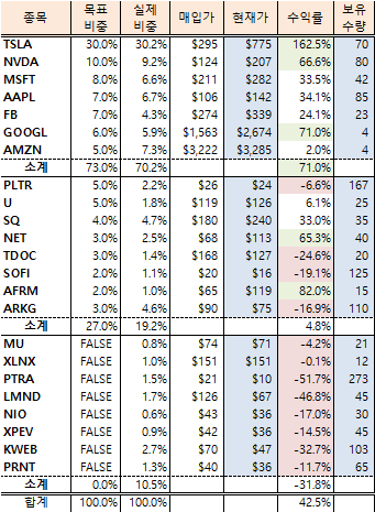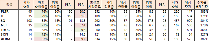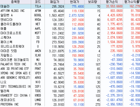 … 보유 종목별로 P/E, P/S를 구하여 밸류에이션을 해보았습니다. 최근 분기 실적에 4배를 곱한 값으로 계산하여 직전 4분기의 합보다는 다소 낙관적인 수치임을 감안해주시기 바랍니다. P/S 값이 50을 넘기는 종목이 3개가 있었고, 모두 이번 조정 기간에 20%~30% 하락한 종목입니다. P/S 값이 너무 높은 종목의 경우에는 주가가 강한 조정을 받을 확률이 높다는 것을 깨달았고, 적정한 P/S값을 찾아 투자해야겠다는 점을 느꼈습니다.… - 와인의 『21년 2월 계좌 결산 中』