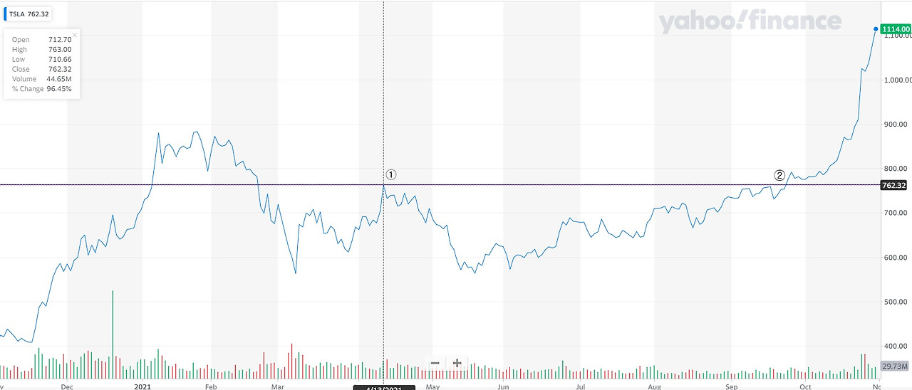 요새 제 주위에서 최고의 화두는 단연 '테슬라'입니다. 이번 달만 약 44% 상승하며 현재 페이스북을 제치고 시가총액 Top 5에 등극하였습니다. 근래 테슬라에게 맞는 단어는 최초, 최대와 같은 수식어가 아닐까 합니다. 자동차 제조기업 상 최초로 1조 달러 클럽 입성, 허츠(Herz)와의 10만 대 계약으로 단일 계약 최대 건수, 분기 최대 생산량, 역대 최대 판매량 등 쉴 새 없이 기사가 쏟아집니다. 테슬라의 주가는 올해 2월 900달러 부근에서 고점을 기록하고, 내리 하락한 후 긴 횡보장을 끝냈습니다. 이 기간 동안 마음고생을 많이 했을 투자자들이 제대로 보상받아 다행이라고 생각합니다.