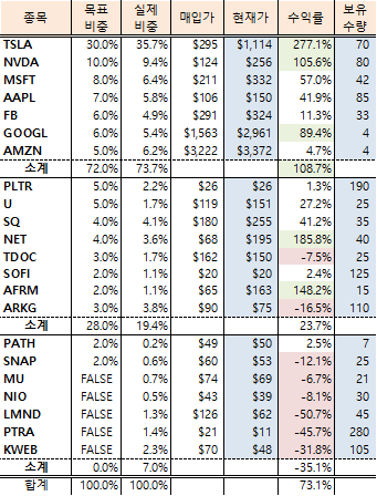 자일링스(XLNX), 샤오펑 모터스(XPEV), 3D 프린트 ETF(PRNT)는 9월에 세운 스크리닝 기준에 부합하지 않아 전량 매도하고 페이스북(FB), 팔란티어(PLTR), 텔레닥(TDOC)을 추가로 매수했습니다. 또, 유아이패스(PATH), 스냅(SNAP)을 신규로 매수 종목에 추가하였습니다.