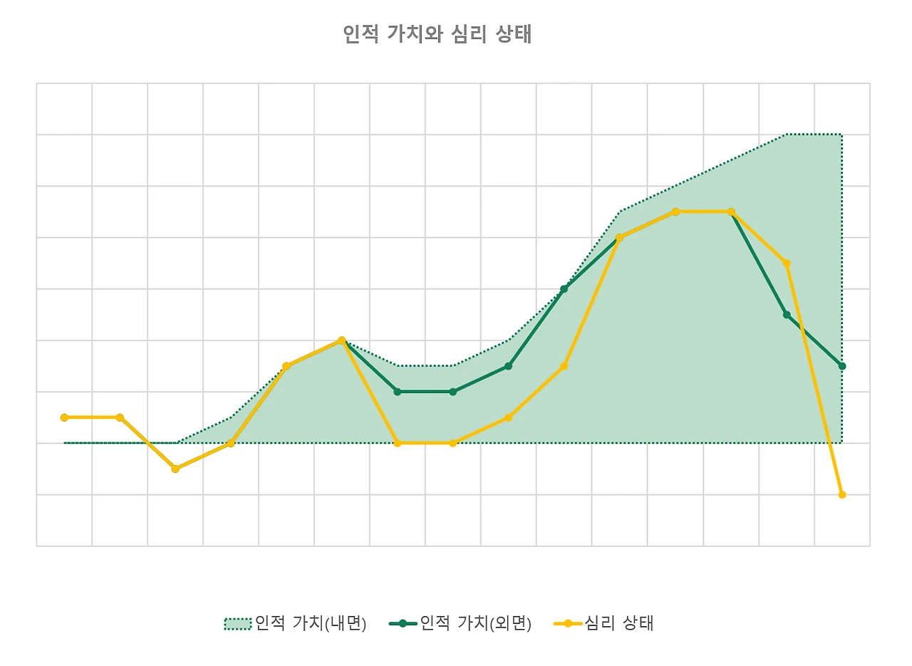 · 유년 시절부터 현재까지 큰 사건의 변곡점을 기준으로 인적 가치와 심리 수준을 나눠 그래프로 이어봄.
