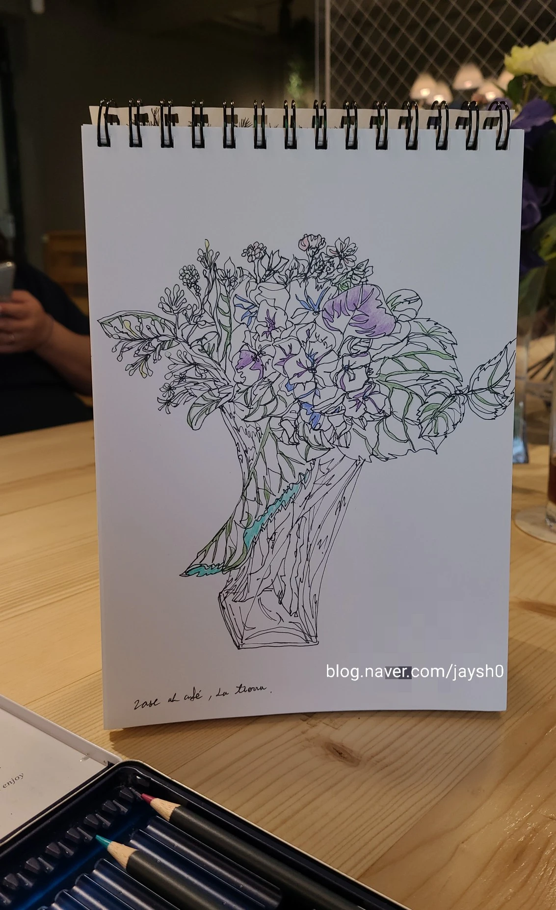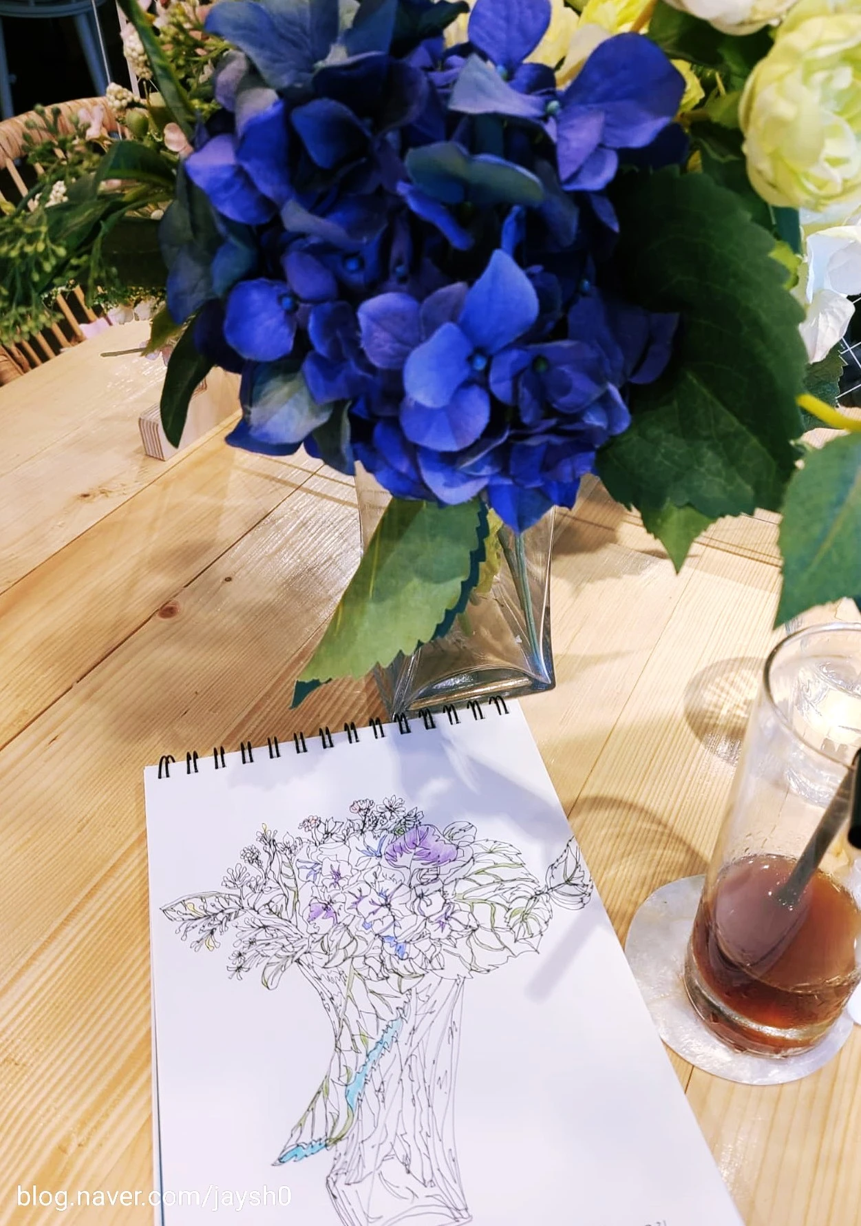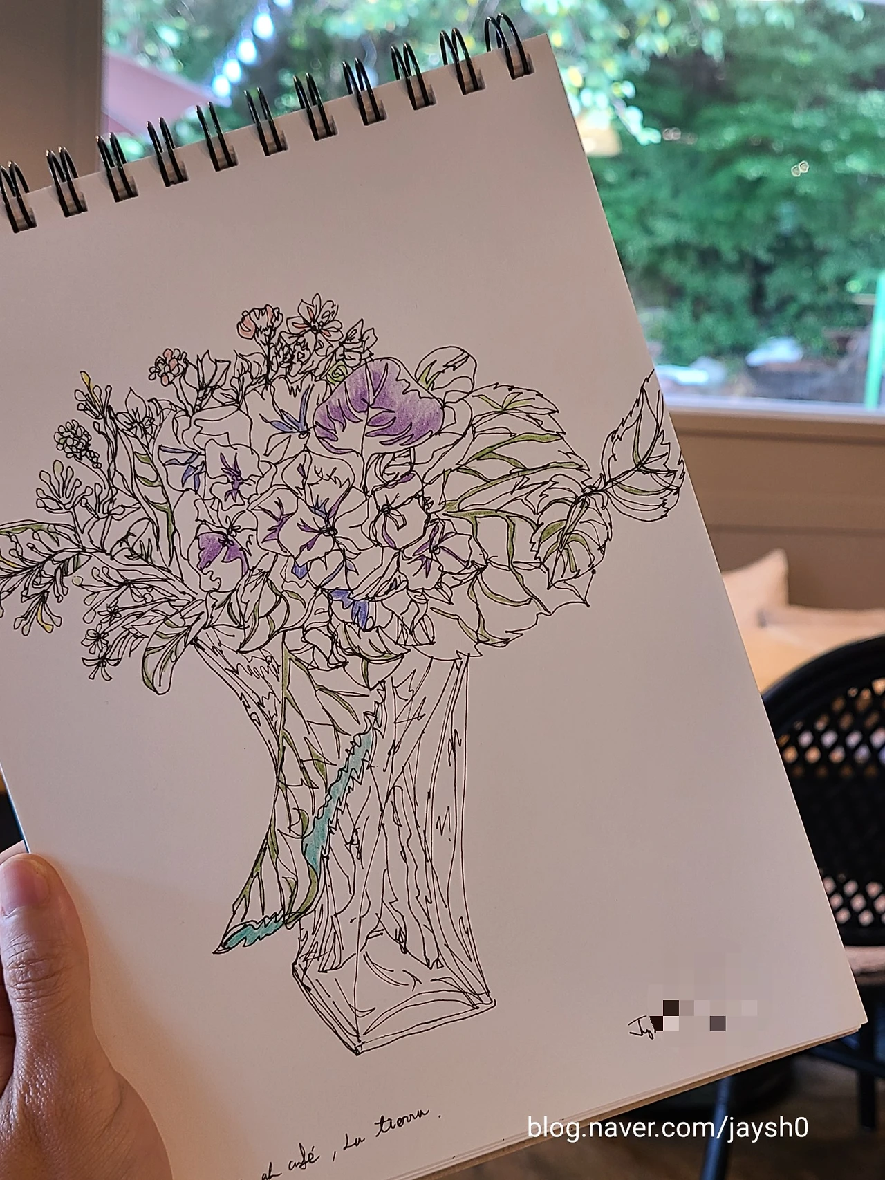이쁜 카페에서 기분 좋게 불가능이 가능이 된 그 순간을 즐기며 그린 꽃그림입니다.
