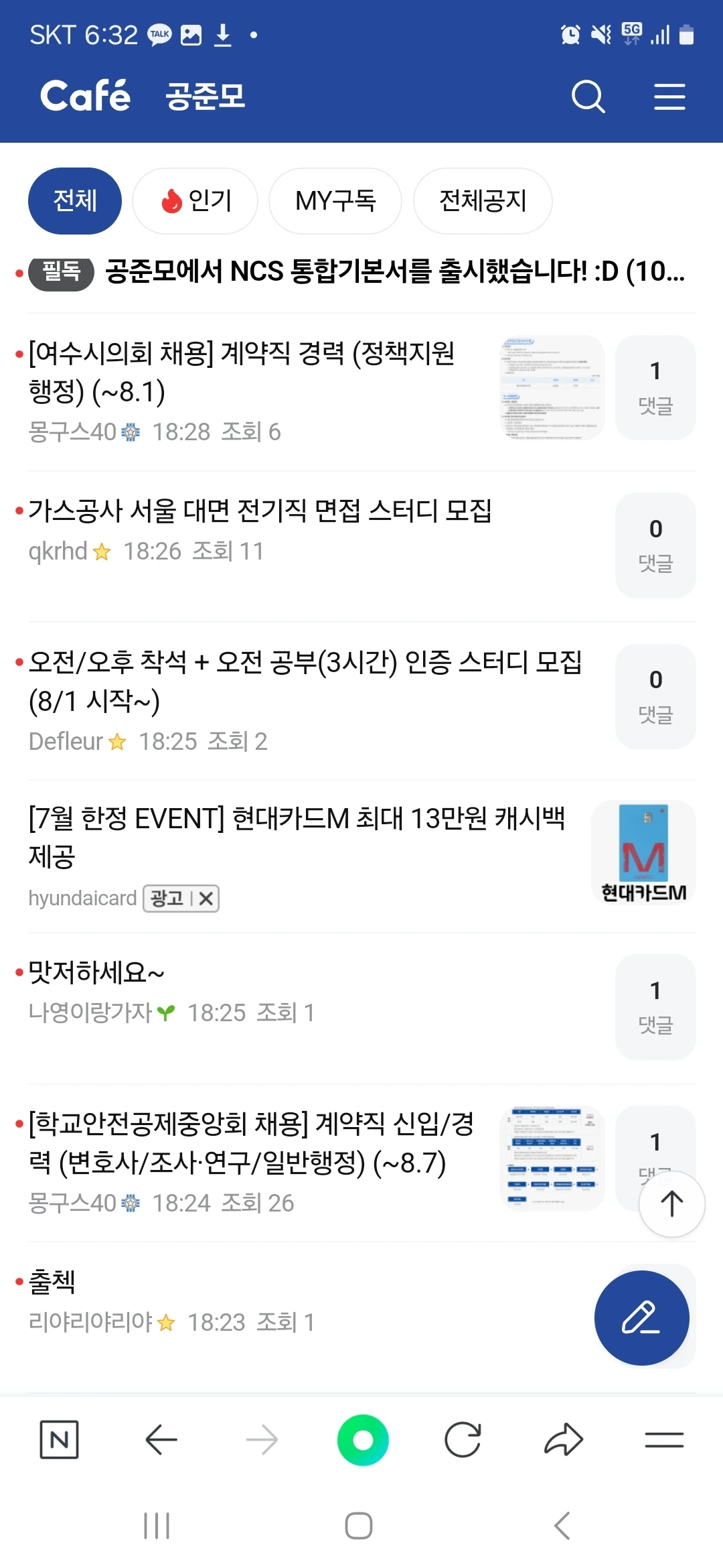 왜냐하면 5대 취업관련 까페중 유일하게 대형기업이 운영하지 않는 곳이다보니 취준생에게 좋은 정보를 무료로 제공하려고 하는 운영진의 몸부림이 느껴졌기 때문입니다. NCS관련 동영상 강의를 인강결제 유도가 아닌 무료로 배포하고 있고(다만 책은 사셔야 함) 일자별 공공기관 입사지원 마감일 캘린더, 스터디 모집, 공공기관 경쟁률정리, 공공기관 합격수기 및 질문이 취준생 중심으로 올라와 있습니다.