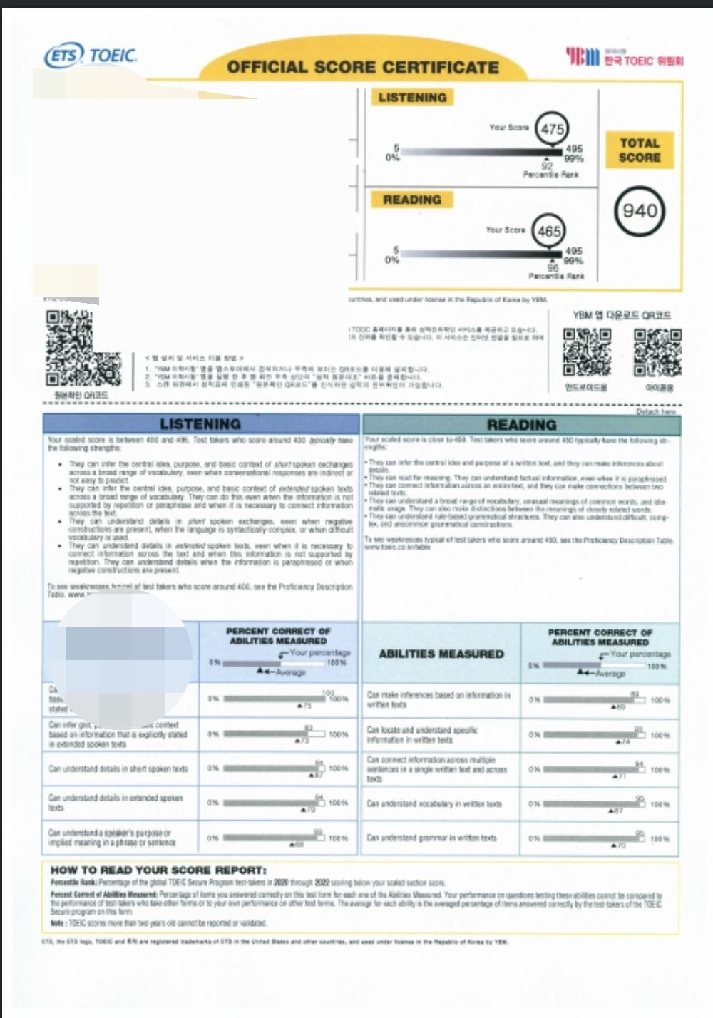 (이런식으로 벼락치기하듯이 받은점수입니다. 더 시간을 투자한다면 더 높은 점수도 기대해볼 수 있겠지만 토익만점이 목표가 아니라 공공기관 입사가 목표이므로 900점 이상만 되면 됩니다)
