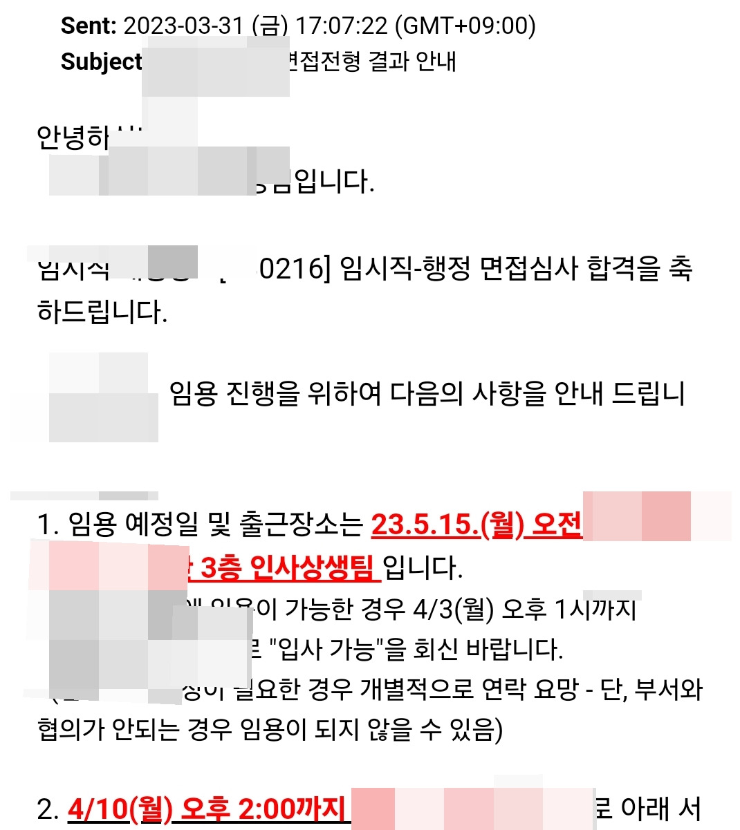2022년 11월부터 실업수당을 받기 시작하여 어느덧 실업급여를 받는 6개월이 거의 끝나갈 무렵이 되었습니다. 그동안 서류통과가 된 기관은 겨우 산중턱에 있던 산중턱기관밖에 없고 그나마 있던 면접의 기회도 블라인드 규정을 몰라 시원하게 면접을 말아먹었습니다. 남편은 2023년 5월부터는 어느 곳이든 일을 하고 있어야 한다며, 그렇지않으면 가정 경제에 큰 어려움이 있다며 으름장을 놓기 시작했고 저 역시 조급해지기 시작했습니다. 분명히 나쁘지 않은 스펙인데, 이다지도 연락이 없다니... 눈물 반 콧물반 울며불며 남편과도 엄청 많이 싸웠던것 같습니다.