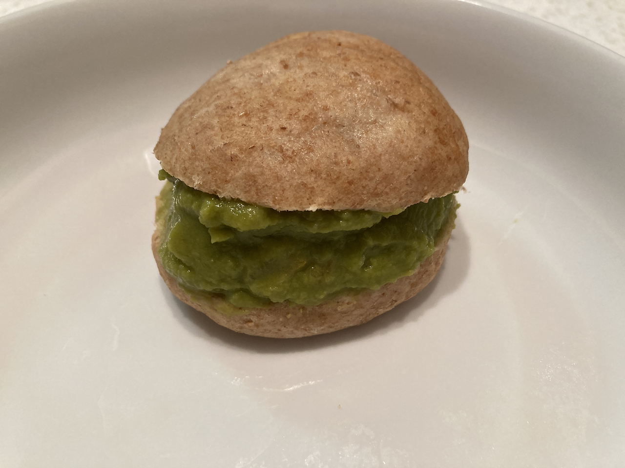 모닝빵을 5초 정도 레인지에 돌린 후 (통밀빵은 살짝 덥혀야 더 구수) 반으로 갈라 차가운 완두앙금을 넣어 먹는다.