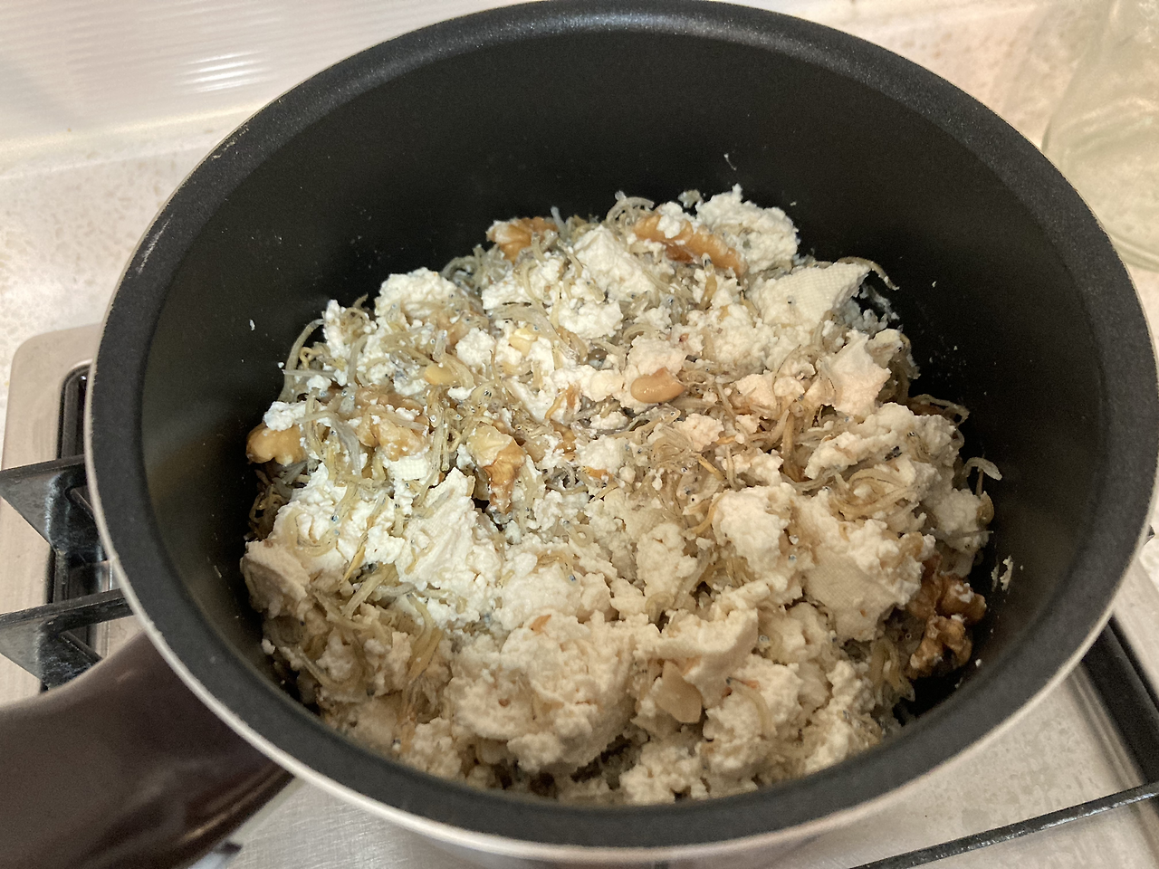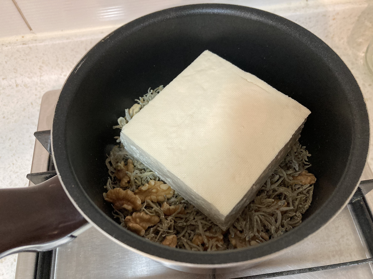 냄비에 멸치와 견과류를 넣고 약한 불에서 먼저 볶는다. (두부는 생으로도 먹지만 멸치는 좀 익혀야 할 것 같아서.) 그냥 한 두어 번 휘저어 주면 된다.