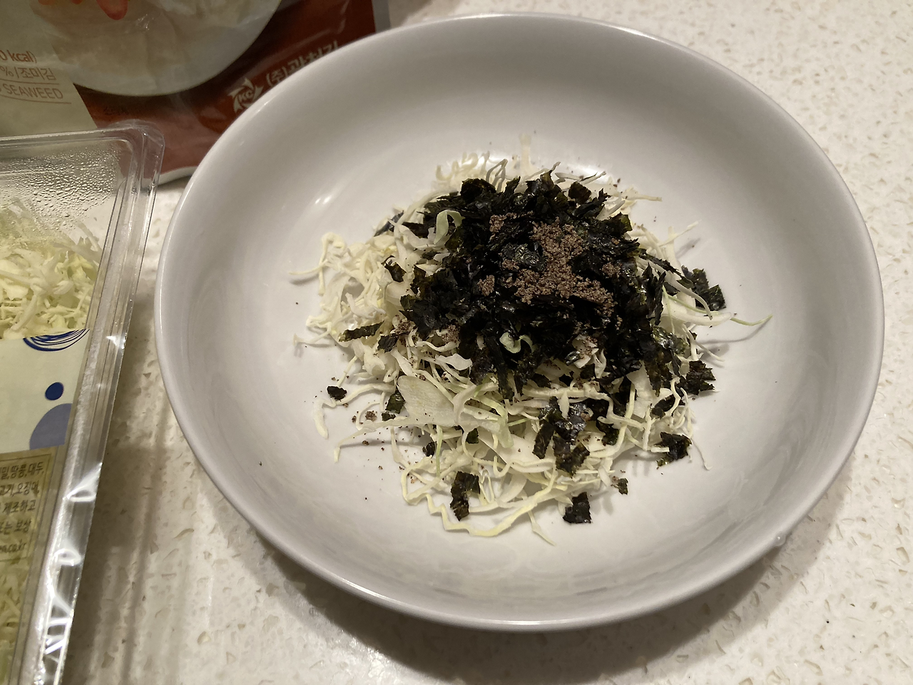 남들은 조미 김가루를 사용했나 보다. 깜짝 놀랄 정도로 맛있다더니 그렇게 맛있지 않다. 그냥 양배추와 김 맛. 그래도 몇 번 먹다 보면 김의 고소한 맛에 그냥도 먹을만하다. 섭섭하면 후춧가루나 들깻가루 등을 뿌려 먹어도 좋다. 후추 추천. 소금 넣으면 더 맛있고. 마찬가지로 맨 위에만 뿌려도 먹을 때 잘 섞인다.