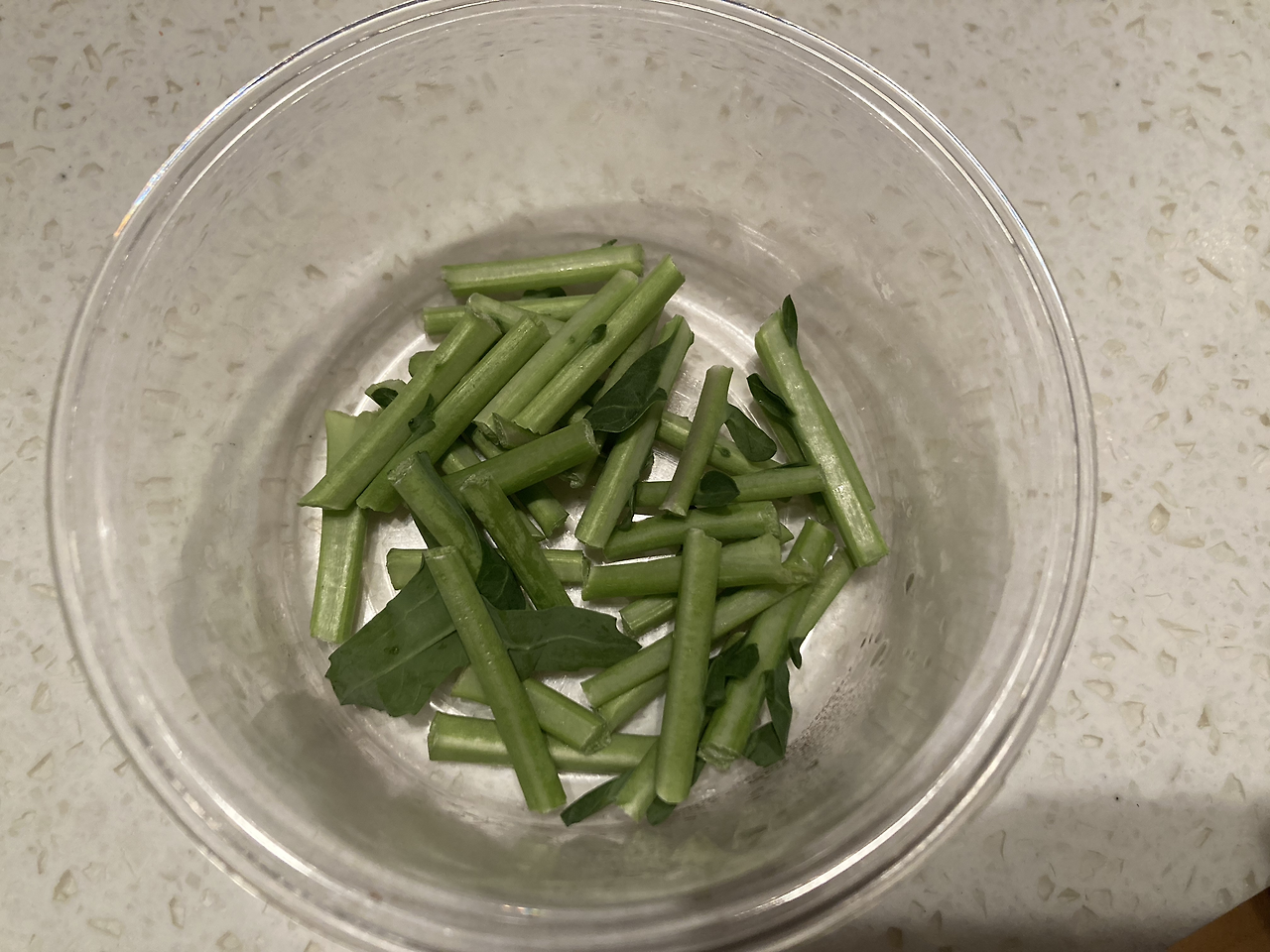(옵션) 케일 줄기 : 나는 케일을 사면 억센 줄기는 가위로 잘라 모아 둔다. 계란찜에 넣거나 된장국에 넣어 처리.