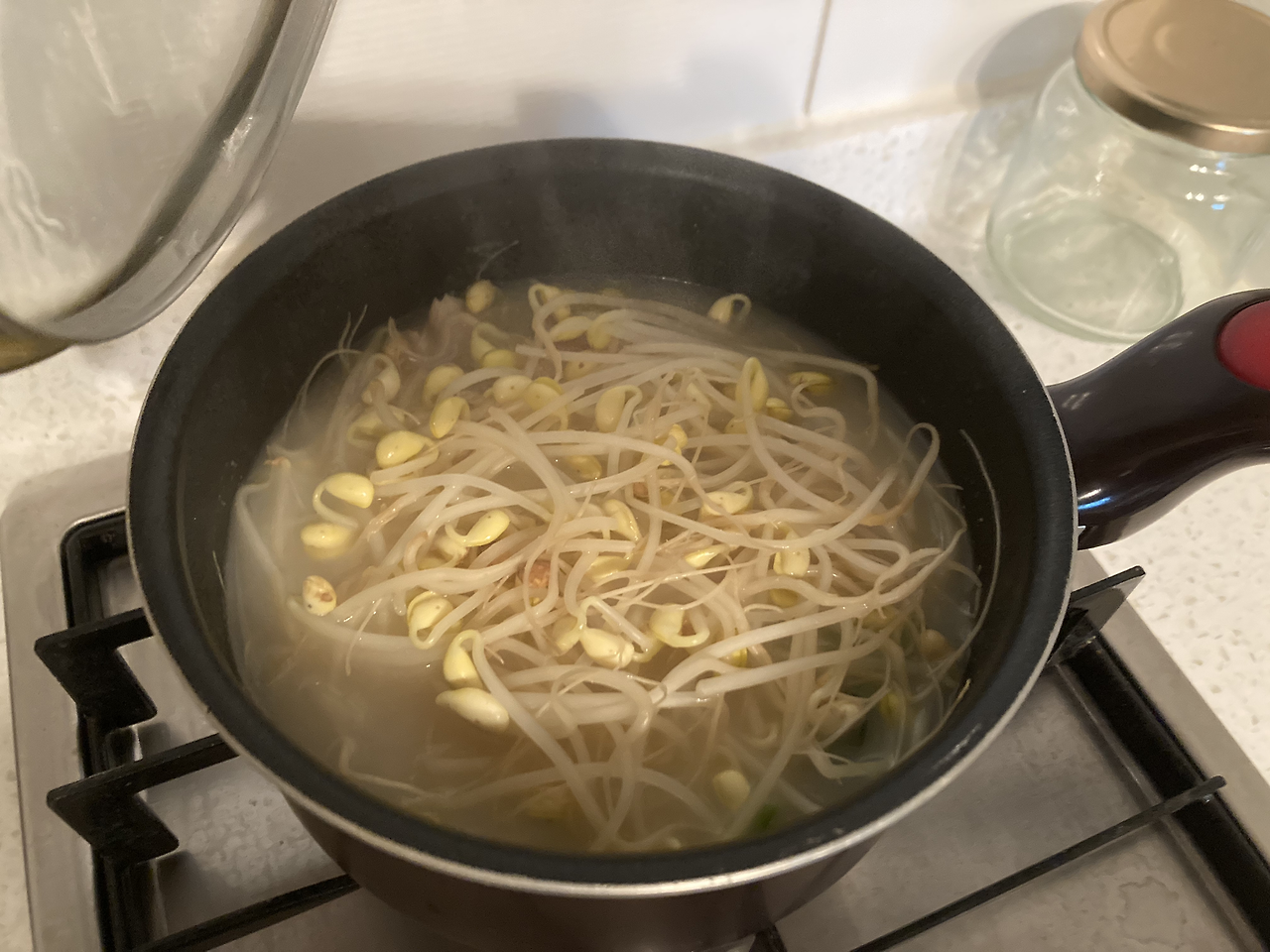 끓어오르면 콩나물 잔뜩 (사진은 150g 정도) 넣고 콩나물이 익을 때까지 3-4분 더 뚜껑 덮고 끓인다.