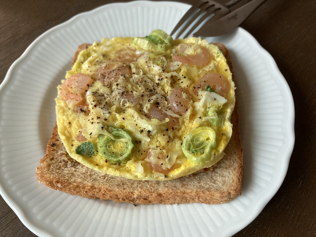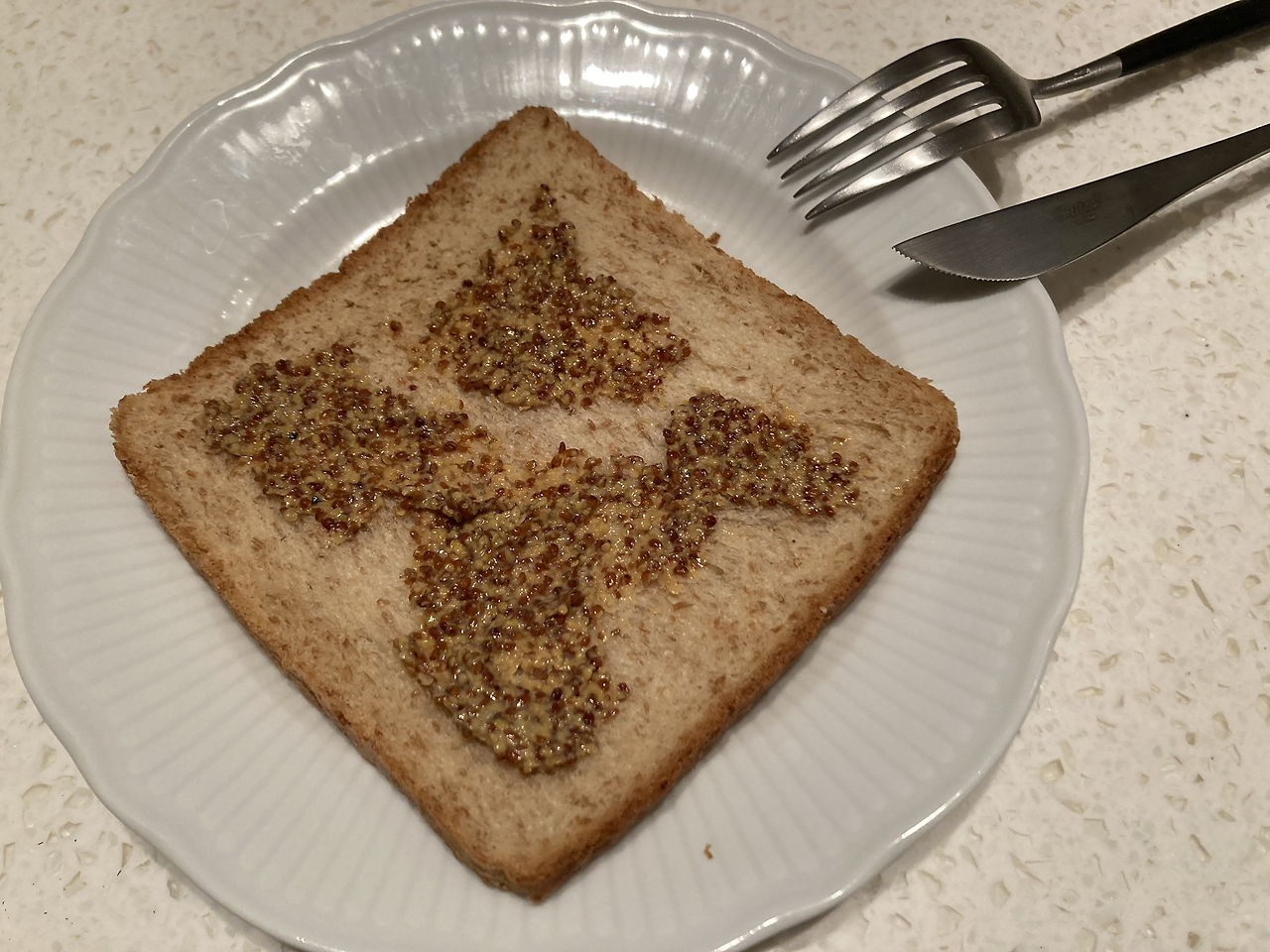 식빵 위에 홀그레인 머스터드를 바르고 계란찜을 올리고 꿀과 후추를 뿌려준다. 꿀은 그냥 뿌려봤다.