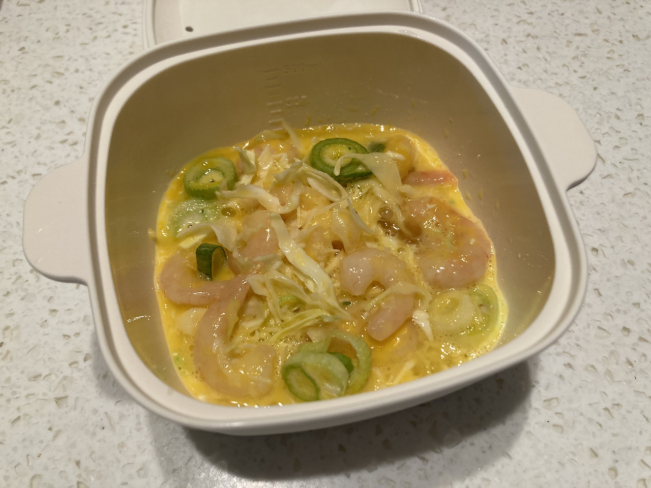 실리콘 용기에 계란 두 개, 양배추채, 동결건조 대파, 새우, 다진 마늘을 넣고 섞는다.