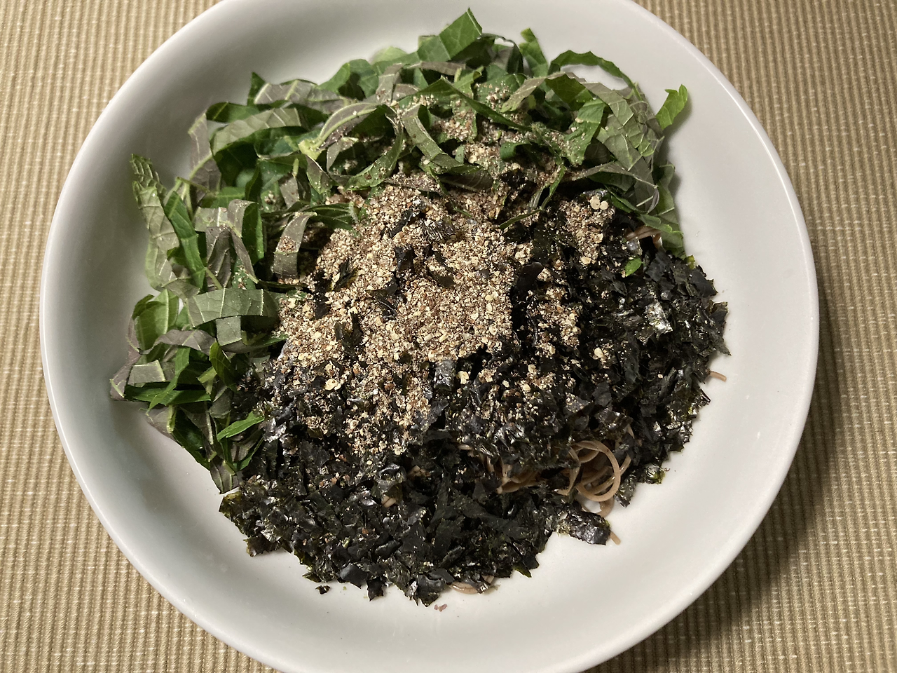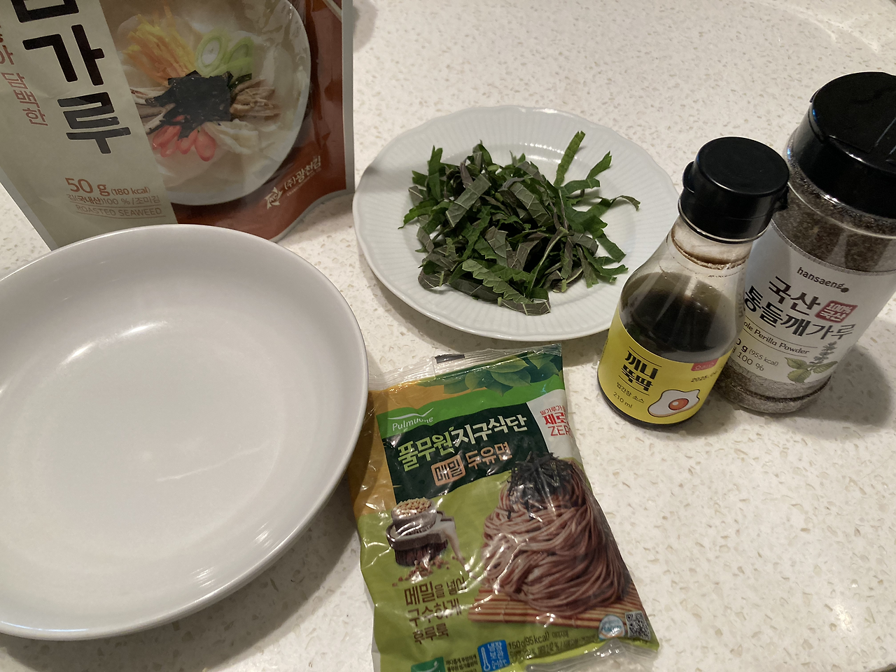 깻잎은 있어서 한 번 넣어보았으나, 안 넣은 게 더 맛있었다. 메밀 들깨면은 심심한 게 맛인데, 깻잎은 자기주장이 너무 강하여 메밀향과 들깨향과 김의 고소함을 눌러버린다. 간단히 들깨 김가루 간장소스만 넣자. 간장소스를 적당히 넣을 줄 아는 손맛이 유일한 어려움이랄까.