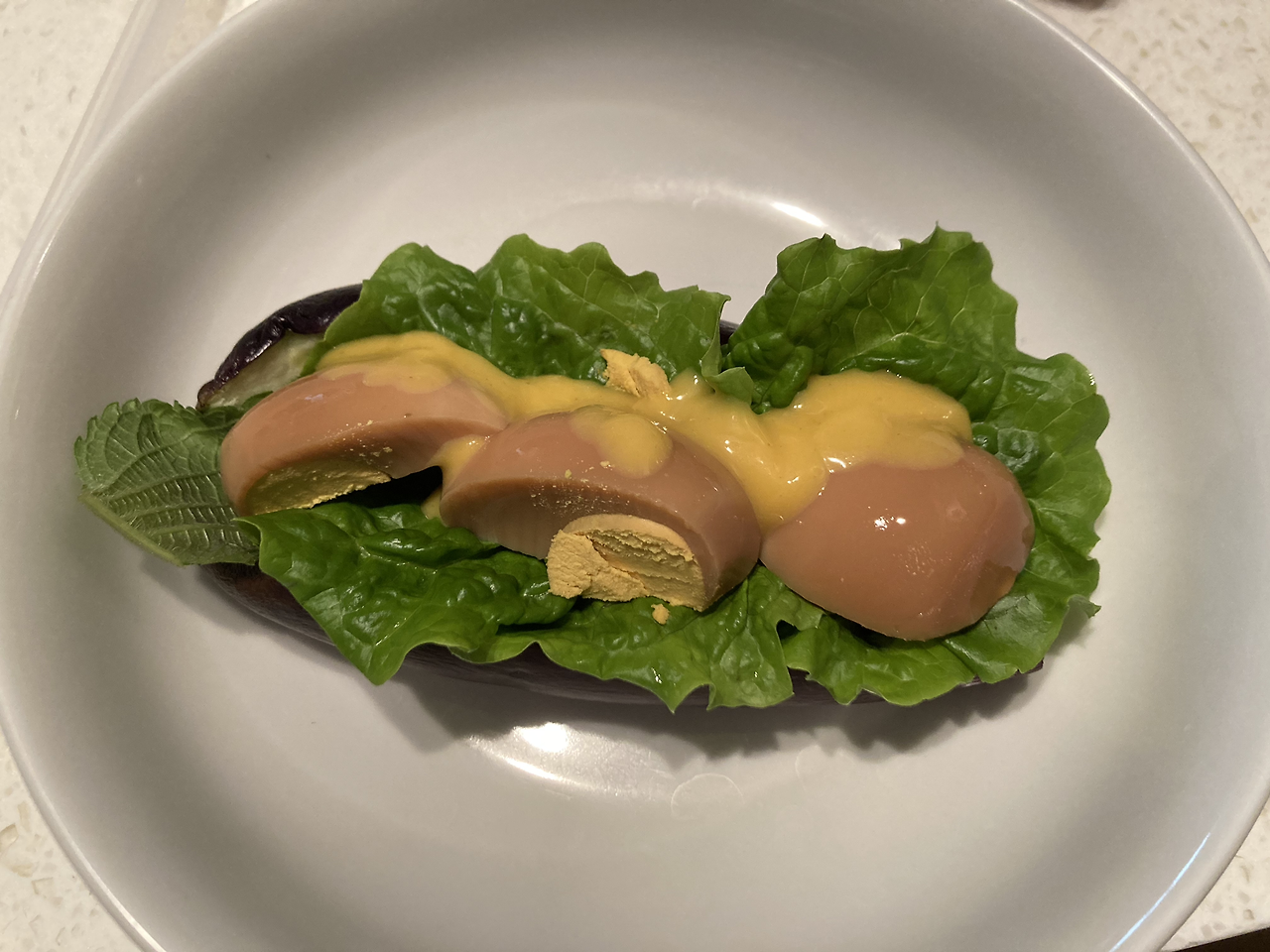 맛은 좋았으나 핫도그처럼 입으로 베어 먹을 수 없다. 가지가 길게 결을 따라서만 찢어지고 세로로는 살짝 질깃한 듯 안 베어진다. 칼로 썰어 먹는 게 좋다.