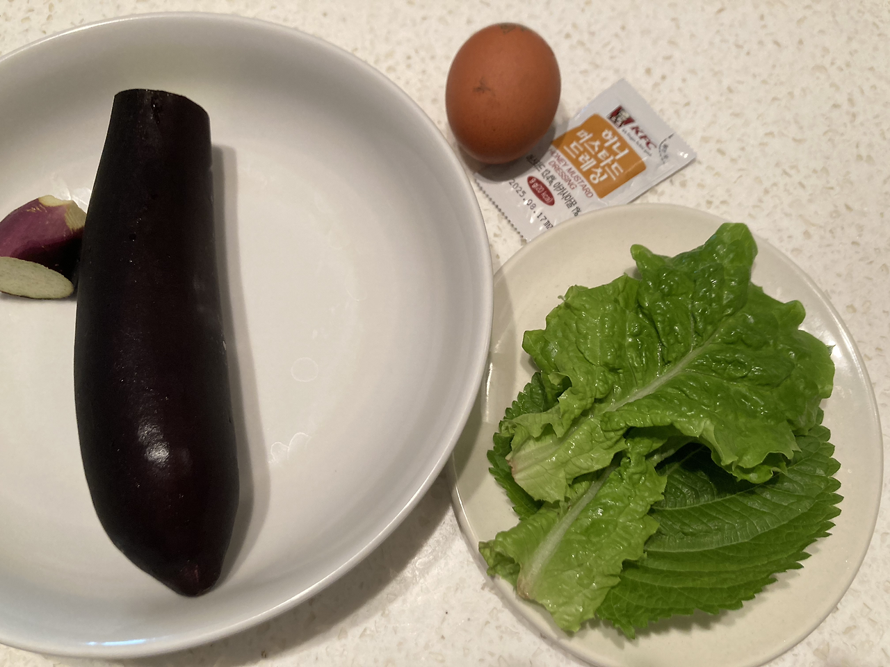 가지를 흐르는 물에 씻고 꼭지를 자른 후 배를 갈라 전자레인지 3분. (접시에 담고 뚜껑 없이 익혔다.)