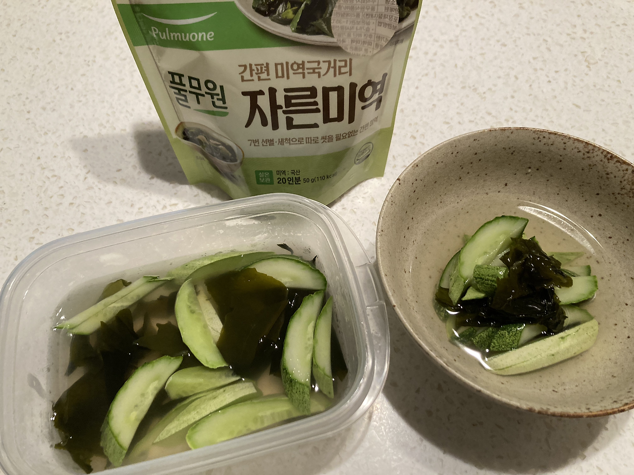 육수를 통에 담고 미역과 오이를 넣는다. 미역은 10배로 불어남을 기억하자.