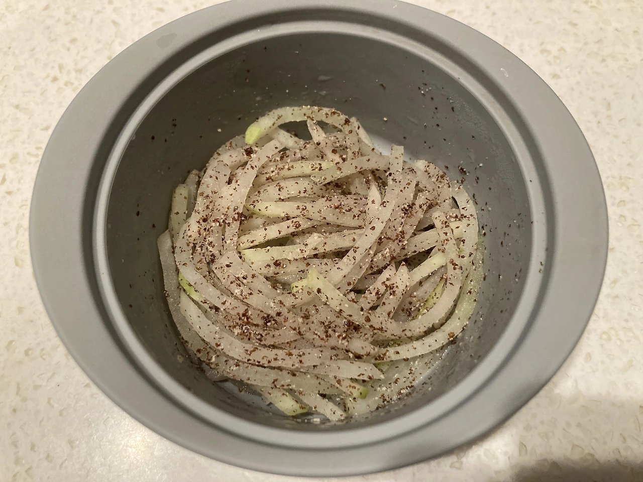 전자레인지 용기에 무채를 담고 들깨가루를 듬뿍 뿌린 후 2분 이상, 원하는 식감이 나올 때까지 돌린다. 끝.