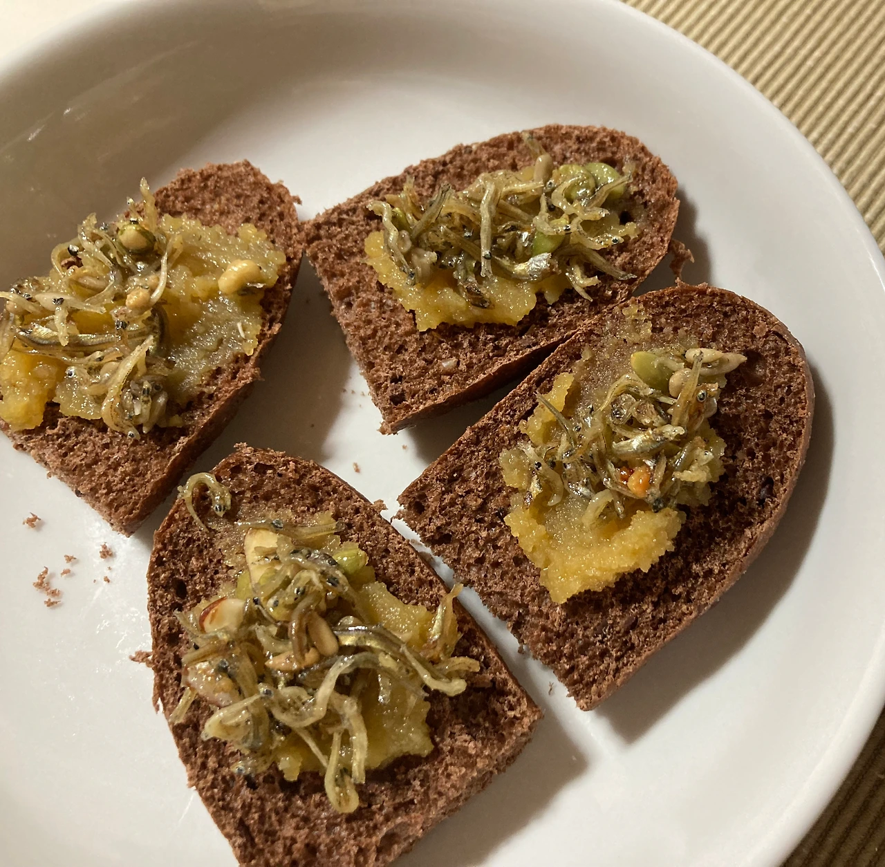 (좌) 통밀 카카오빵에 카야토스트를 바르고 멸치를 올린 것. (우) 현미 쌀식빵에 멸치만 올린 것. 카야잼 없이 멸치만 올려 먹어도 맛있다.