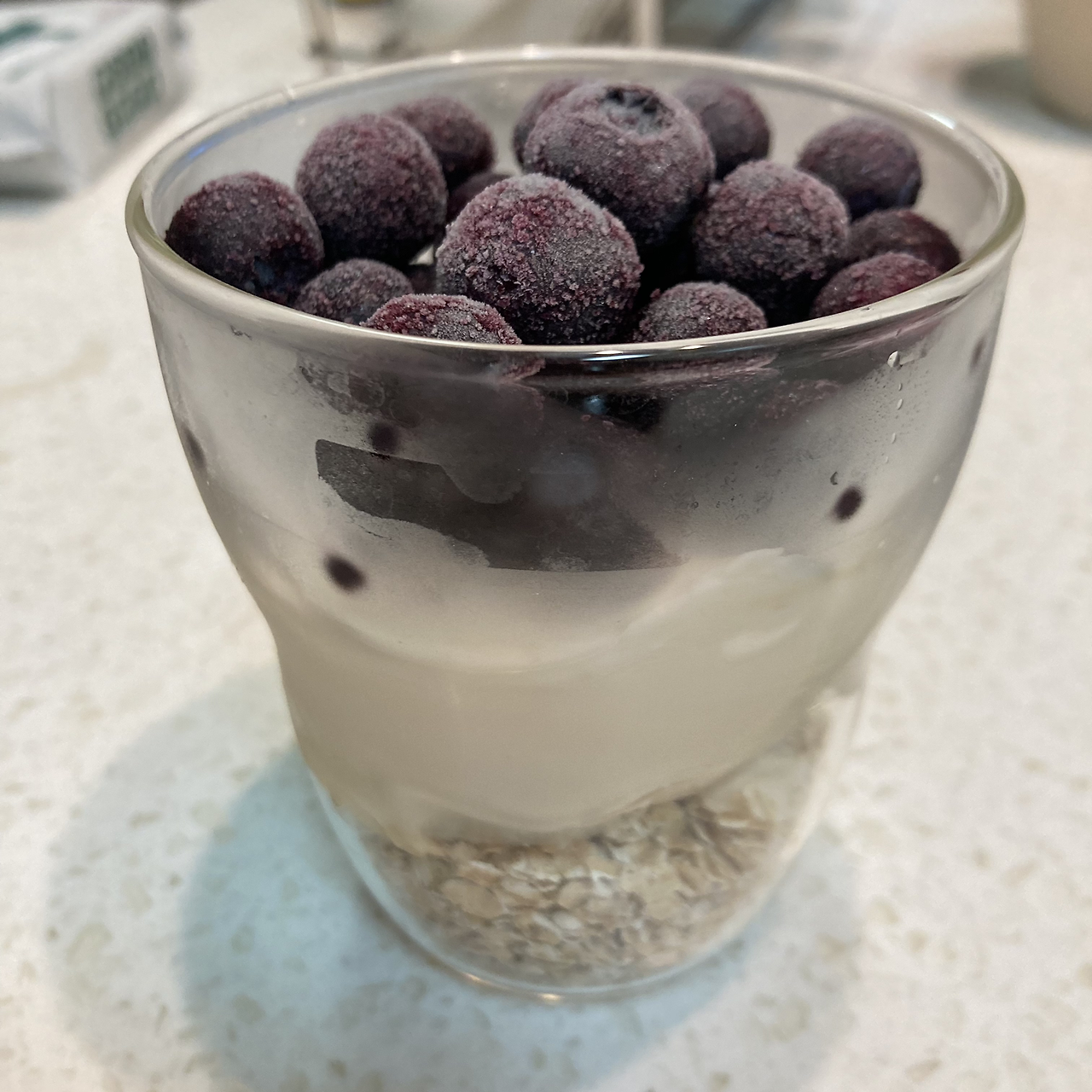 뚜껑을 덮어 냉장고에 넣어둔다. 하룻밤 지나면 오트밀이 연두부와 냉동과일에서 나온 물에 불어 죽처럼 된다.