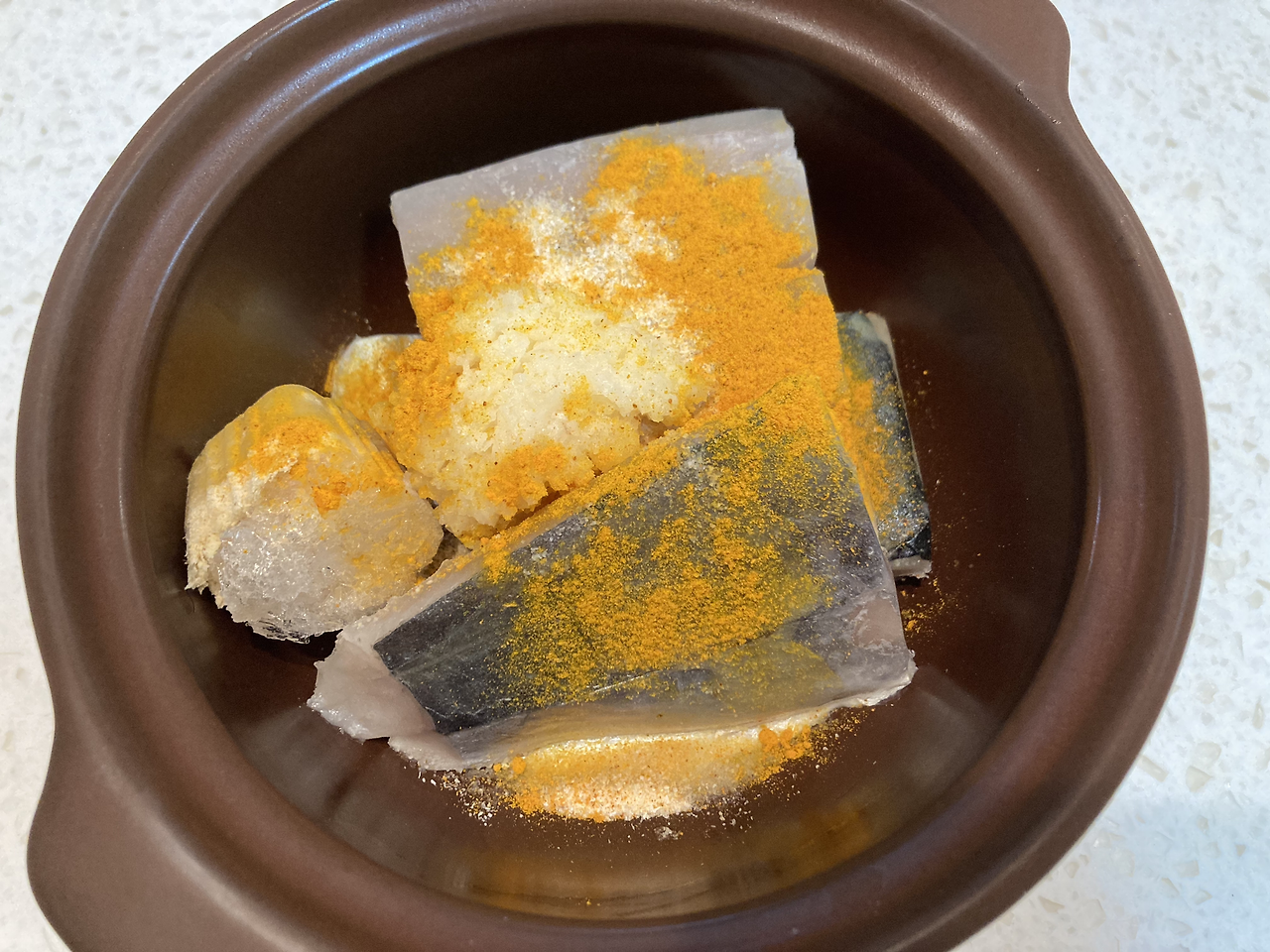뚝배기에 냉동 삼치 조각 3개를 넣는다.