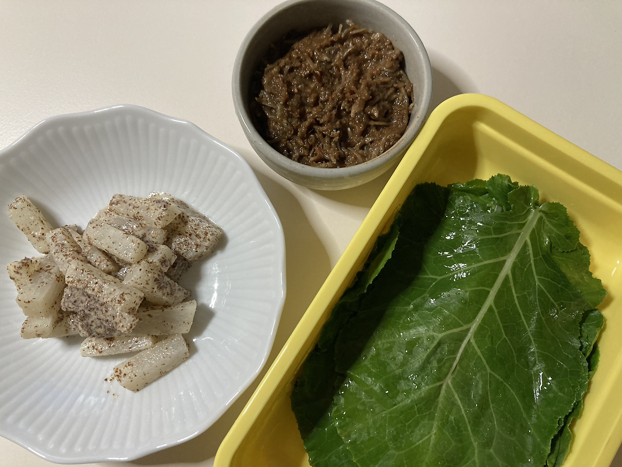 무나물: 남은 무를 작게 썰어서 뚝배기에 넣고 들깨가루를 뿌린 후 어메이징 오트를 자작하게 약간만 넣는다. 전자레인지에서 2분 정도 돌린다.