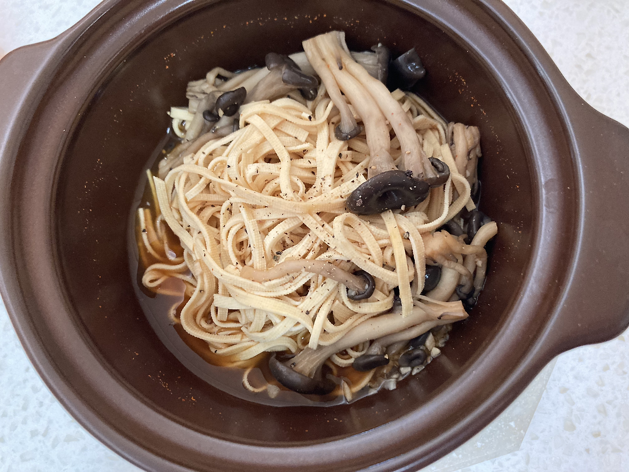 뚝배기에 다진 마늘, 라면스프, 버섯을 넣고 전기포트로 물을 끓여 조금 넣는다. 나는 라면 국물이 자작한 짜글이 형태를 좋아해서 조금만 넣었다.