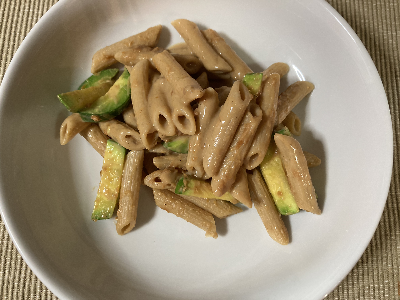 잘 비벼 먹으면 꾸덕한 크림소스가 된다. 통밀, 땅콩버터, 애호박의 조합이 훌륭하다. 갈비 양념소스는 너무 많이 넣지 않도록 주의해야 한다. 땅콩버터 때문에 짠맛이 가려져서 많이 넣기 쉽다. 파스타 삶은 김에 바로 냄비에서 소스를 섞어도 되는데, 애호박 익히기가 애매해서 전자레인지에 돌렸다. 소스랑 애호박만 먼저 돌리고 뒤에 파스타를 섞어도 될 것 같다.