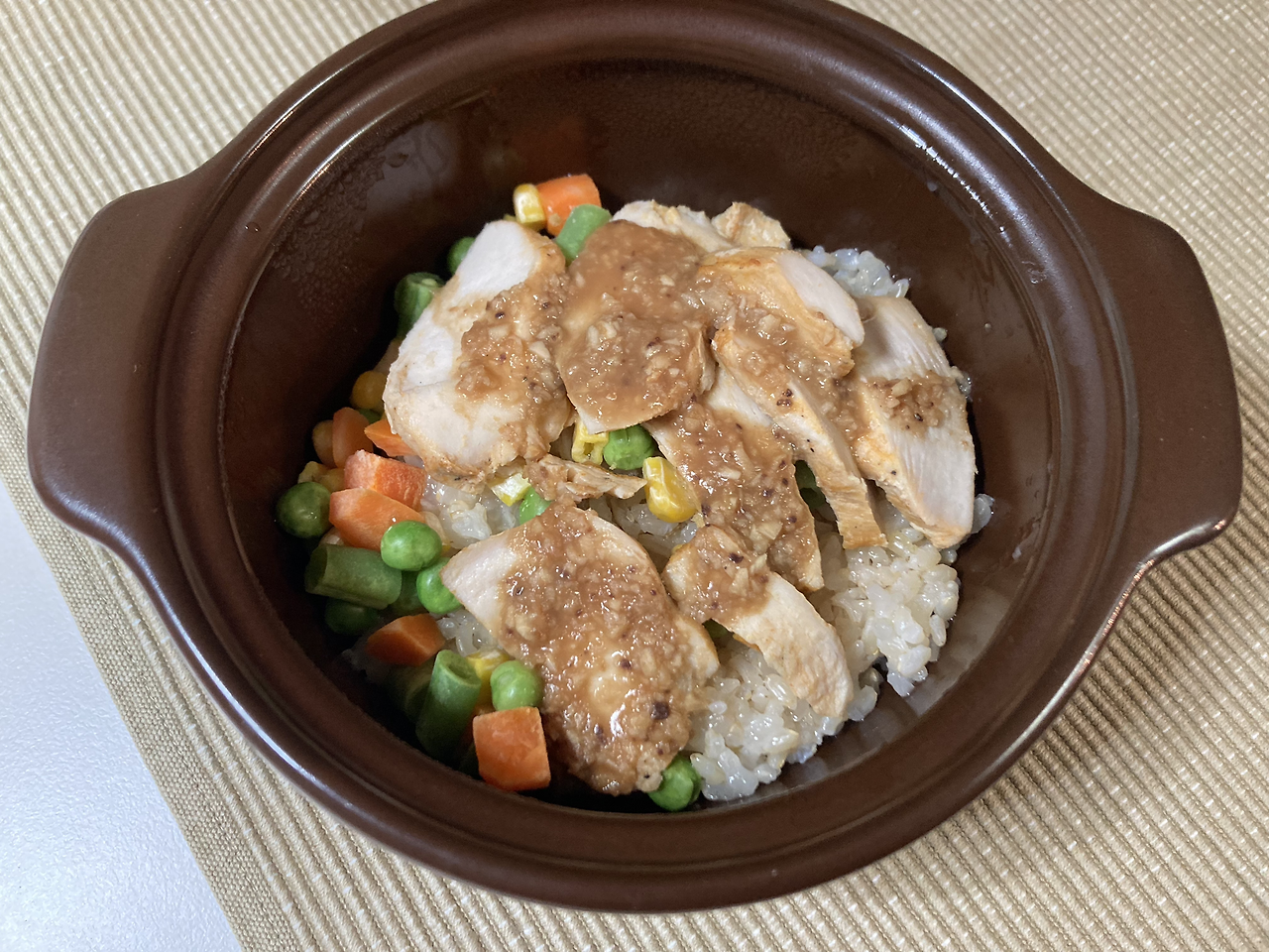 뚝배기에 햇반과 냉동야채와 냉장실에서 해동한 닭가슴살을 넣고, 소스를 닭가슴살 위에 뿌리고 전자레인지 2-3분.